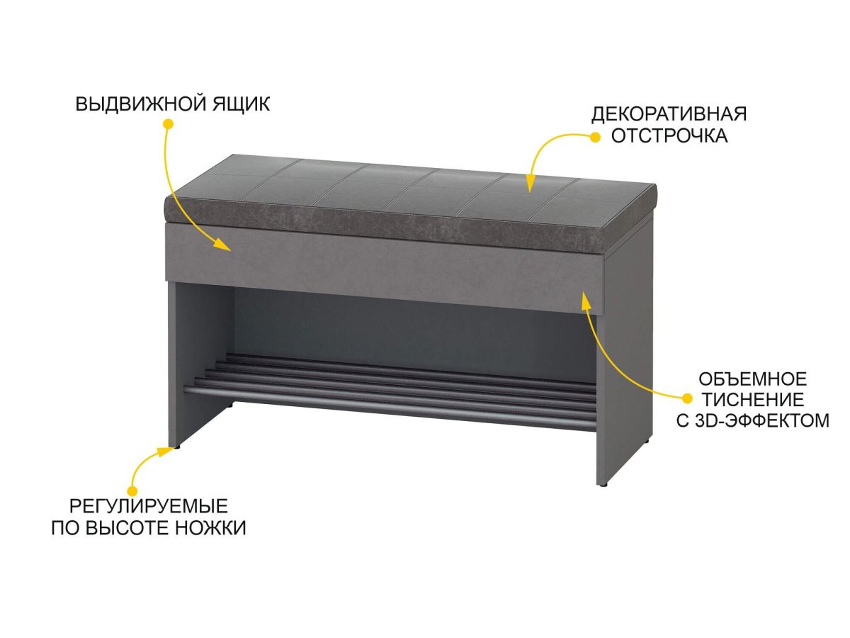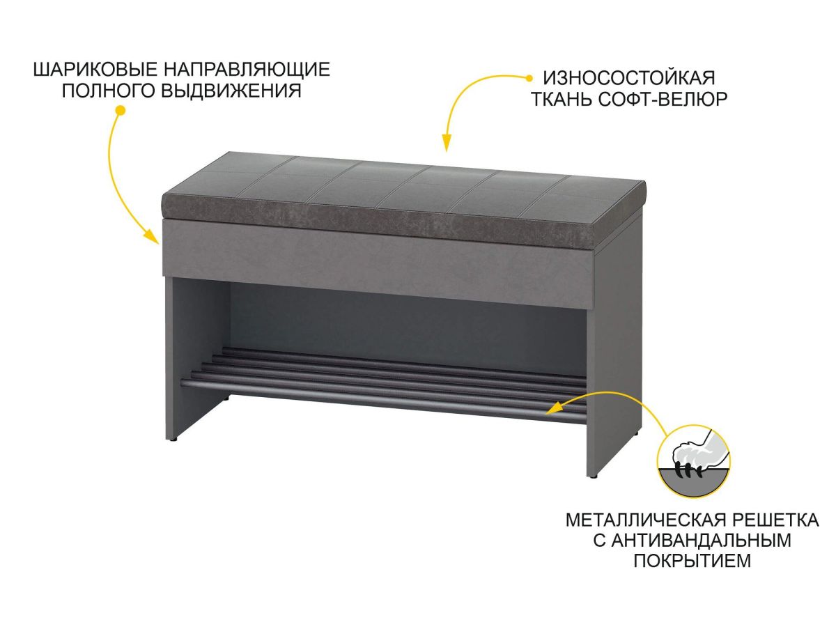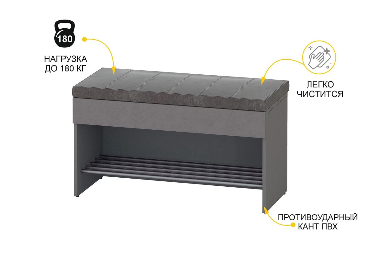 - Банкетка произведена из ЛДСП повышенной плотности. Материал устойчив к механическим и термическим воздействиям. ЛДСП выдерживает min 300 циклов на истирание, что почти в 5 раз больше, чем требуется по ГОСТу (min 65).