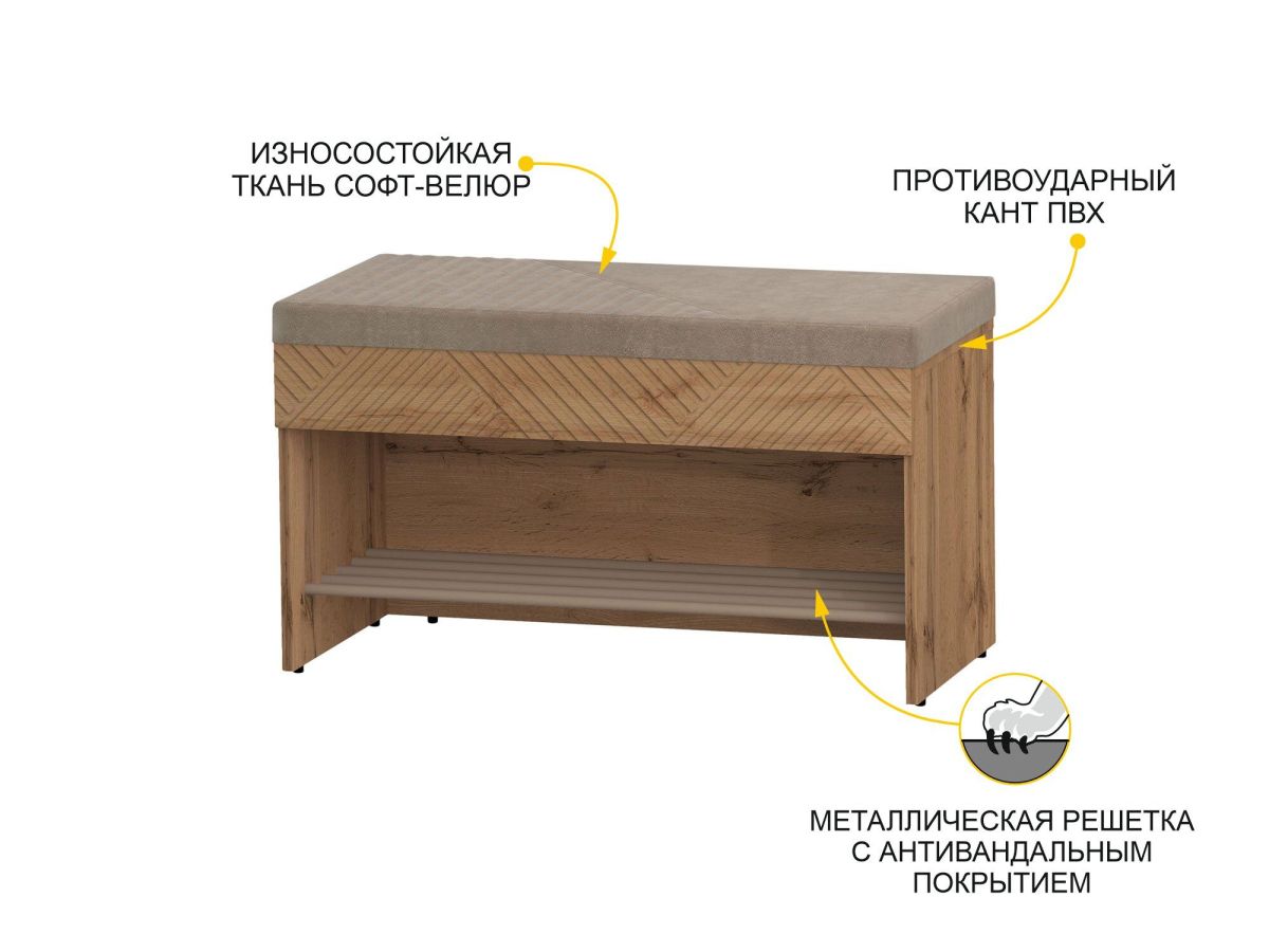 - Банкетка произведена из ЛДСП повышенной плотности. Материал устойчив к механическим и термическим воздействиям. ЛДСП выдерживает min 300 циклов на истирание, что почти в 5 раз больше, чем требуется по ГОСТу (min 65).