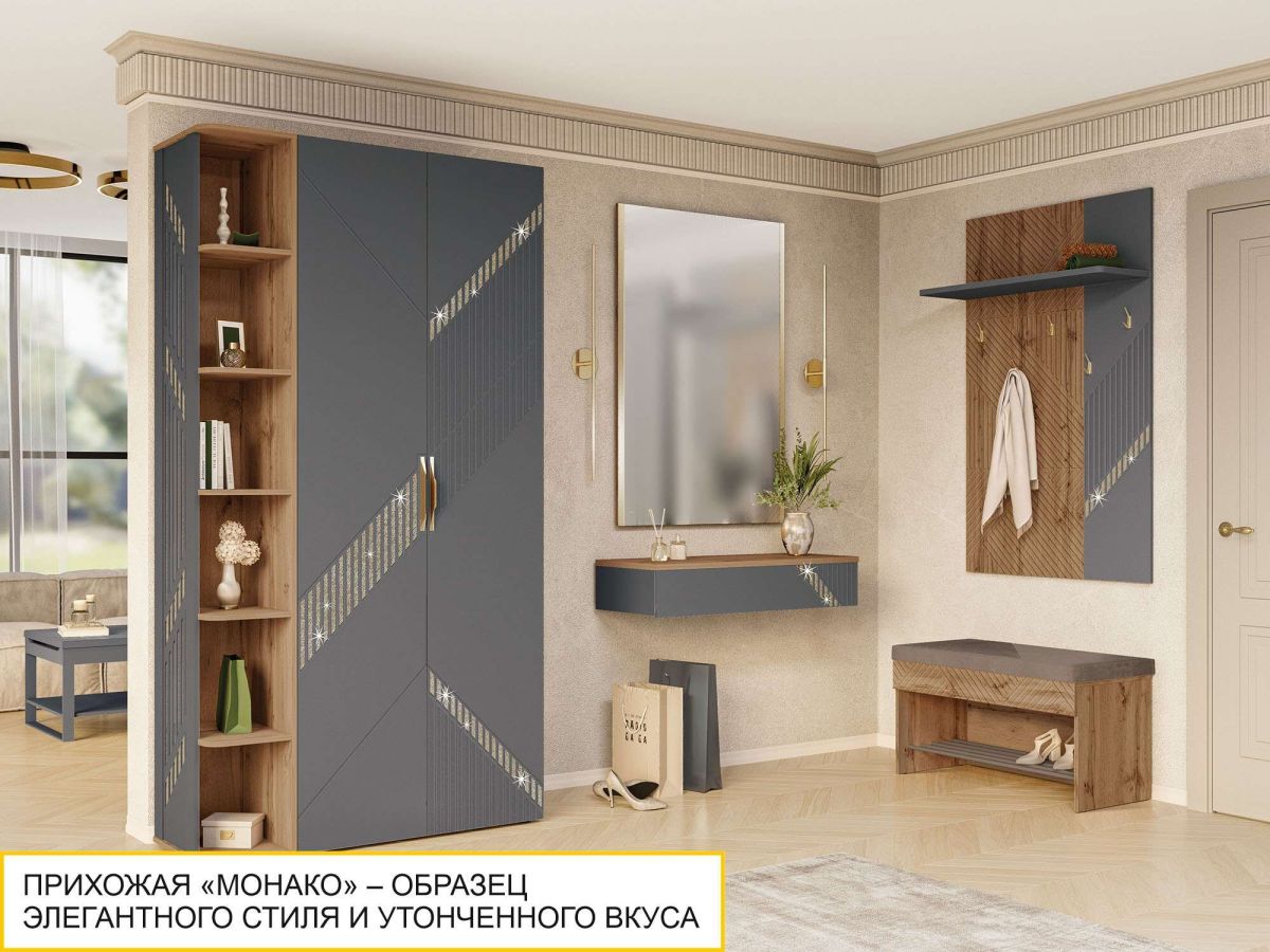 Банкетка «Монако 402.05» является частью модульной серии «Монако». «Монако 402» – образец элегантного стиля и утонченного вкуса. Сочетание матовой графитовой поверхности фасадов с благородной древесной текстурой «Дуб Вотан» создает особую атмосферу гармонии и комфорта.