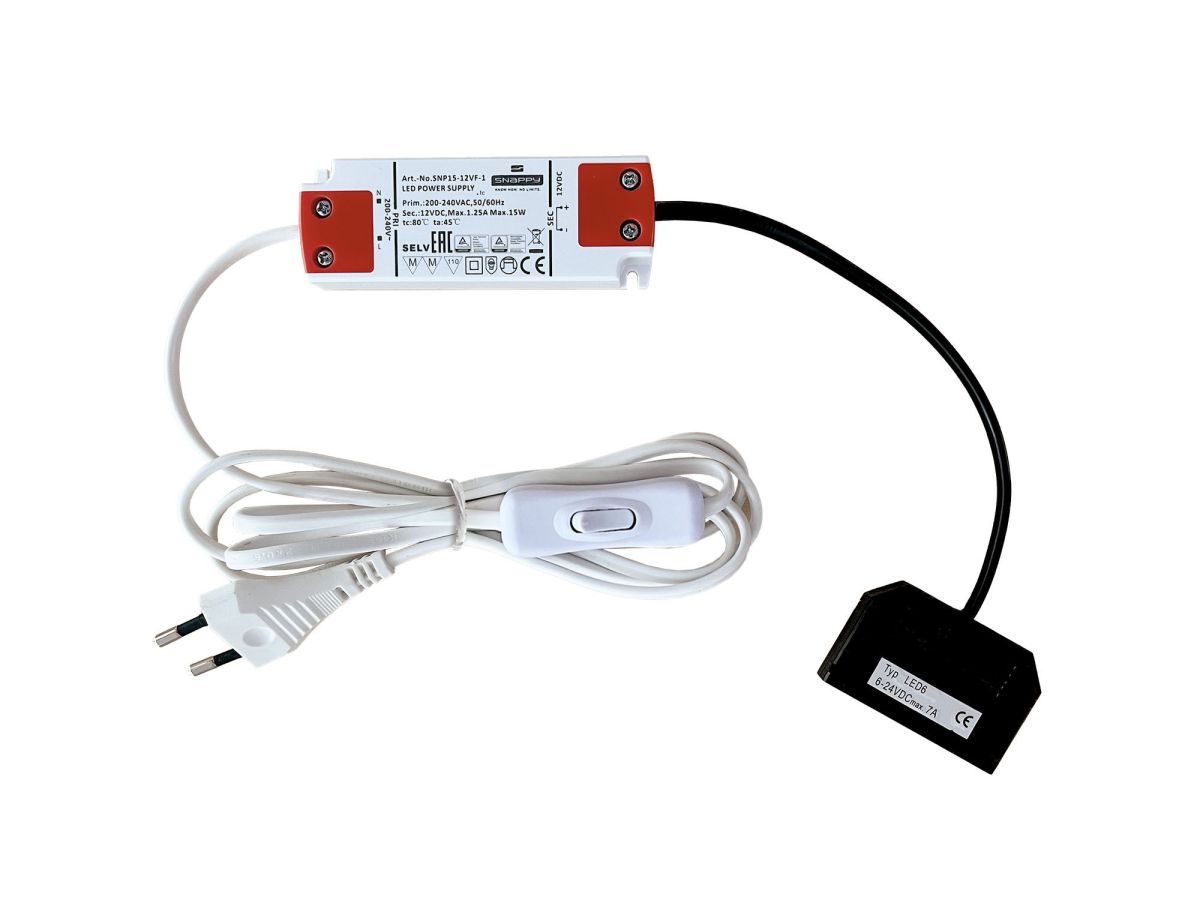 Компактный блок питания предназначен для подключения светодиодной подсветки. В комплект входят сетевой провод с вилкой, источник питания и соединительный коннектор на 6 разъемов.