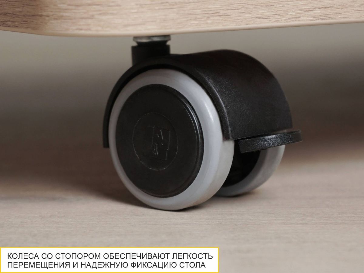 • Усиленные поворотные колеса позволяют легко перемещать столик по комнате. Стопоры на колесах обеспечивают надежную фиксацию стола в нужном положении.