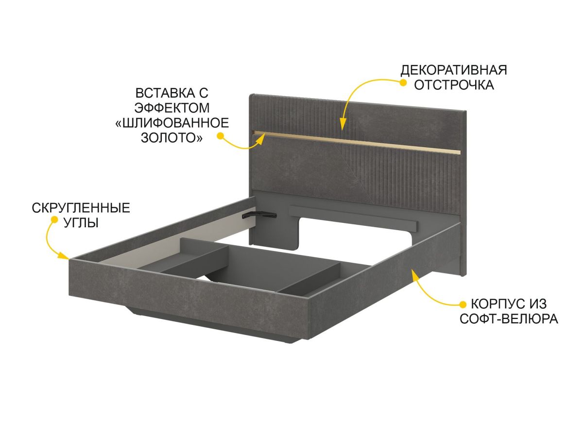 • Стильная отстрочка в сочетании с металлизированной декоративной вставкой с эффектом шлифованного золота придают кровати изысканный внешний вид.