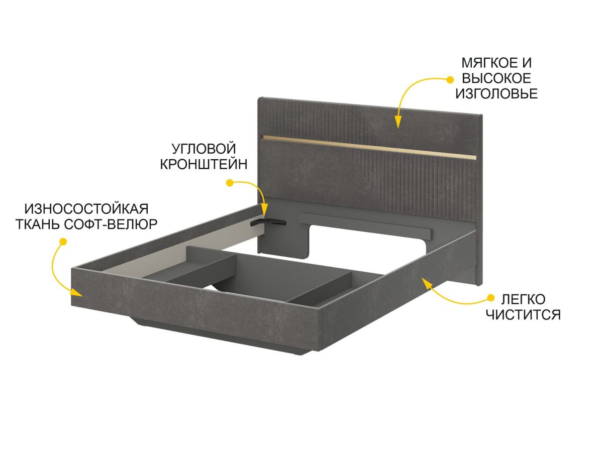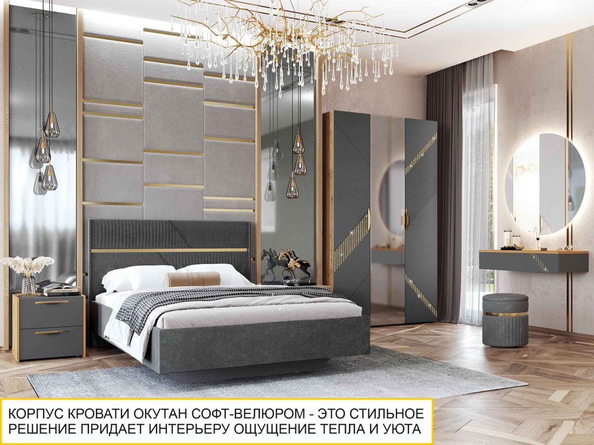 • Актуальный цвет обивки кровати «Десерт серый» прекрасно сочетается с модулями коллекции, а также с предметами интерьера любой другой цветовой гаммы.