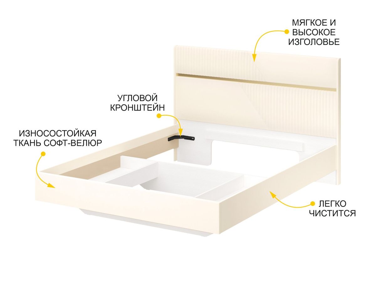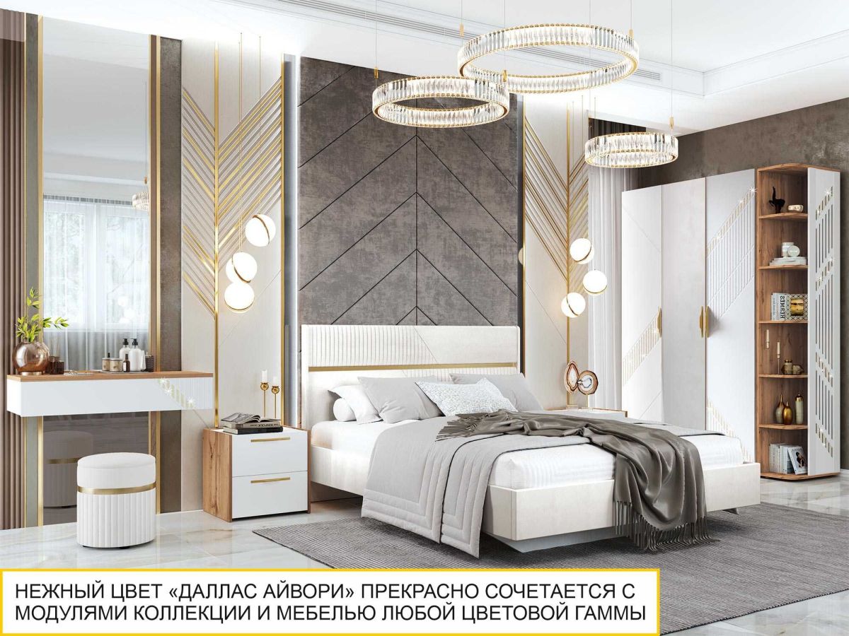 • Актуальный цвет обивки кровати «Даллас Айвори» прекрасно сочетается с модулями коллекции, а также с предметами интерьера любой другой цветовой гаммы.