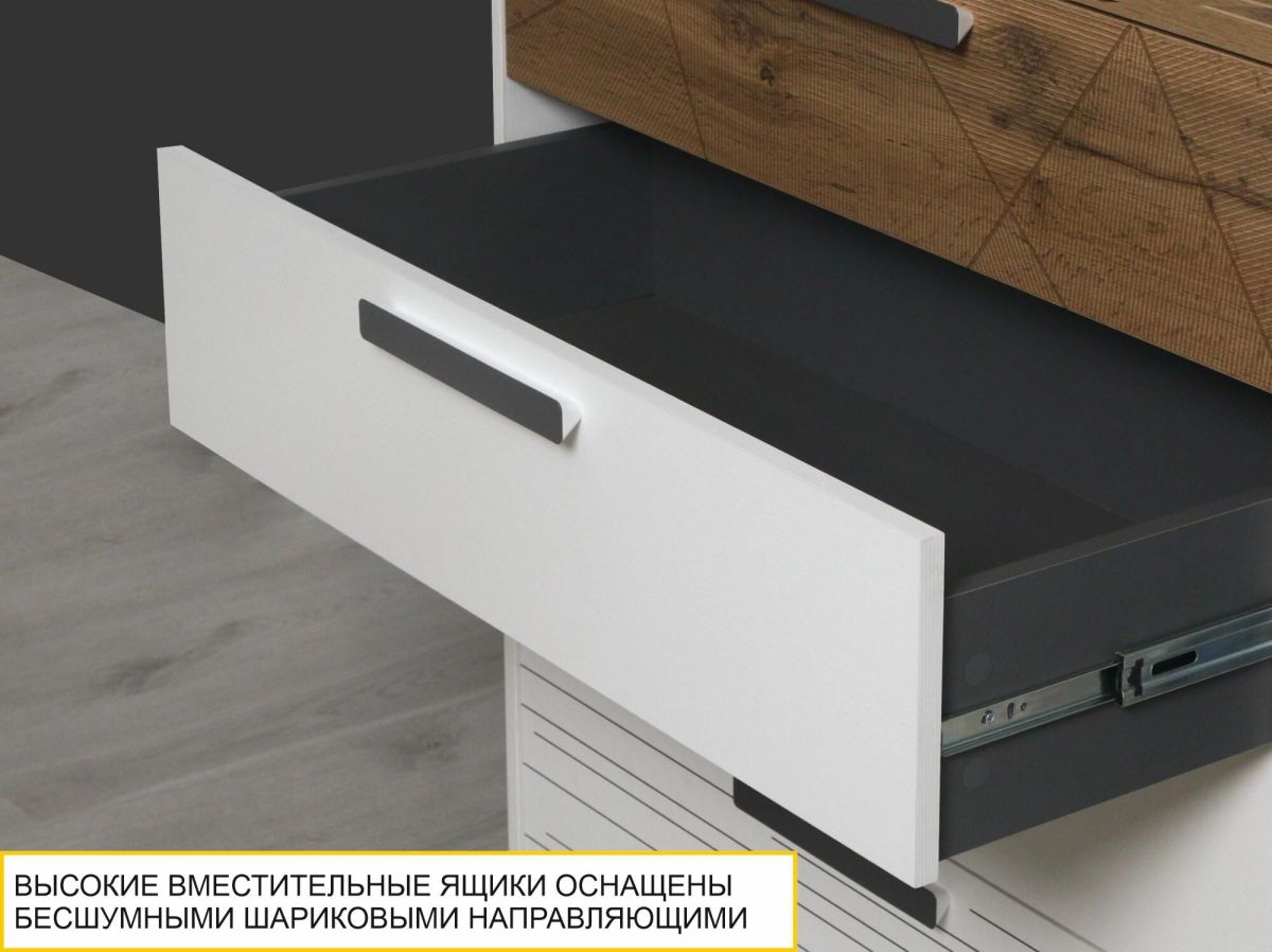 - Высокие вместительные ящики оснащены бесшумными шариковыми направляющими полного выдвижения. Качественная фурнитура гарантирует удобство и долговечность.