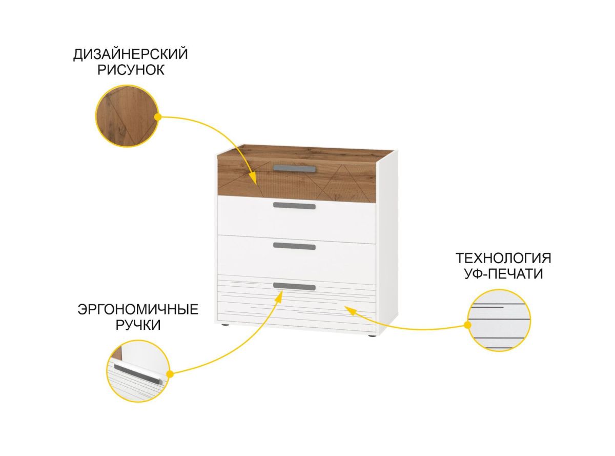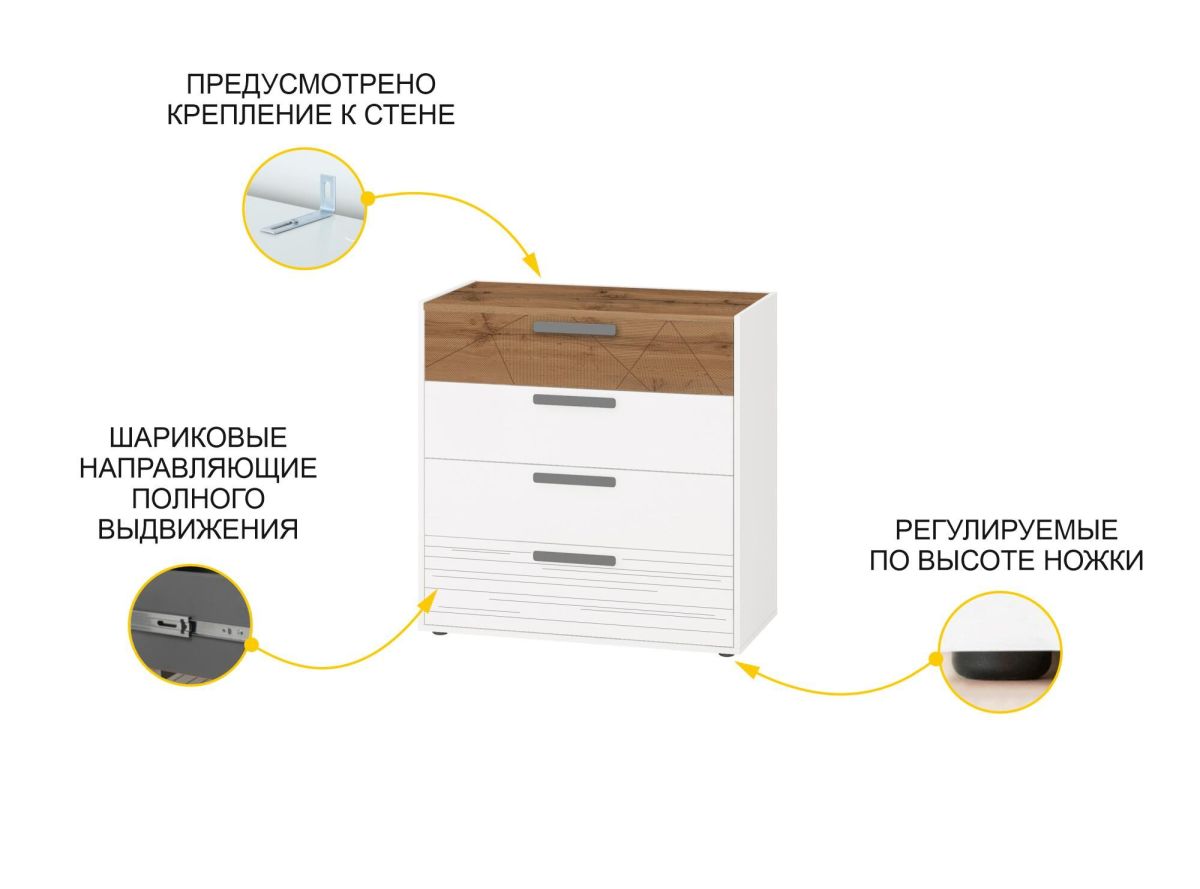 - Комод произведен из ЛДСП повышенной плотности. Материал устойчив к механическим и термическим воздействиям. ЛДСП выдерживает min 300 циклов на истирание, что почти в 5 раз больше, чем требуется по ГОСТу (min 65).