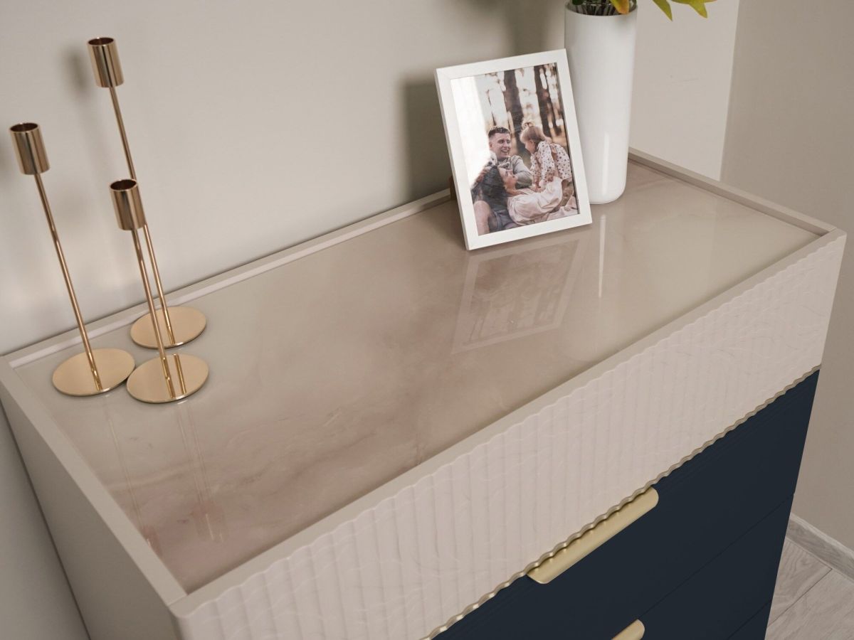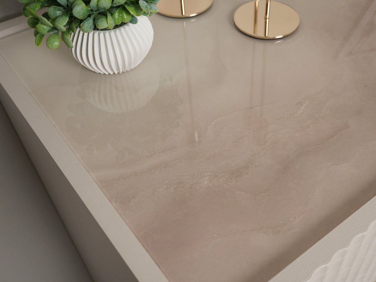 - Стеклянный топ комода декорирован дизайнерским рисунком «Мрамор». Легкое мерцание глиттера придает поверхности глубину и добавляет в интерьер нотку роскоши.