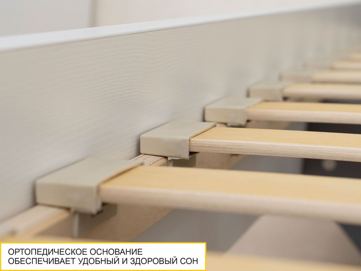 - Кровать укомплектована ортопедическим основанием с ламелями, которое помогает телу принимать правильное положение во время сна и отдыха. Также оно позволяет матрасу «дышать», оберегает его от деформации и значительно продлевает срок службы.
