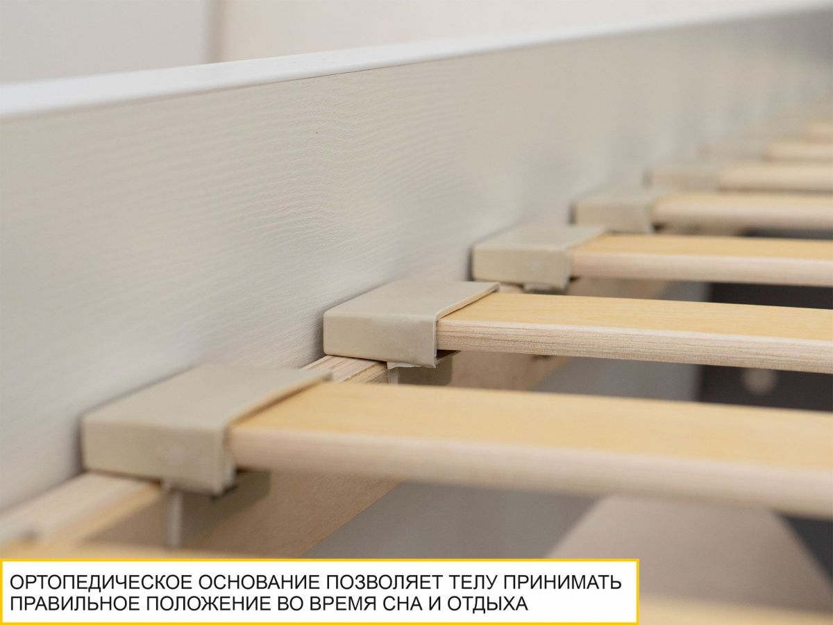- Кровать укомплектована ортопедическим основанием, которое помогает телу принимать правильное положение во время сна и отдыха. Также оно позволяет матрасу «дышать», оберегает его от деформации и значительно продлевает срок службы.