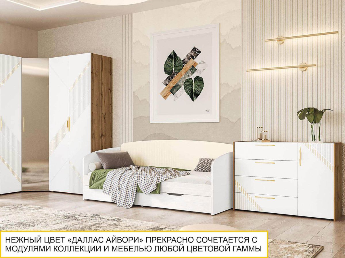 - Актуальный цвет обивки кровати «Даллас Айвори» прекрасно сочетается с модулями коллекции, а также с предметами интерьера любой другой цветовой гаммы.