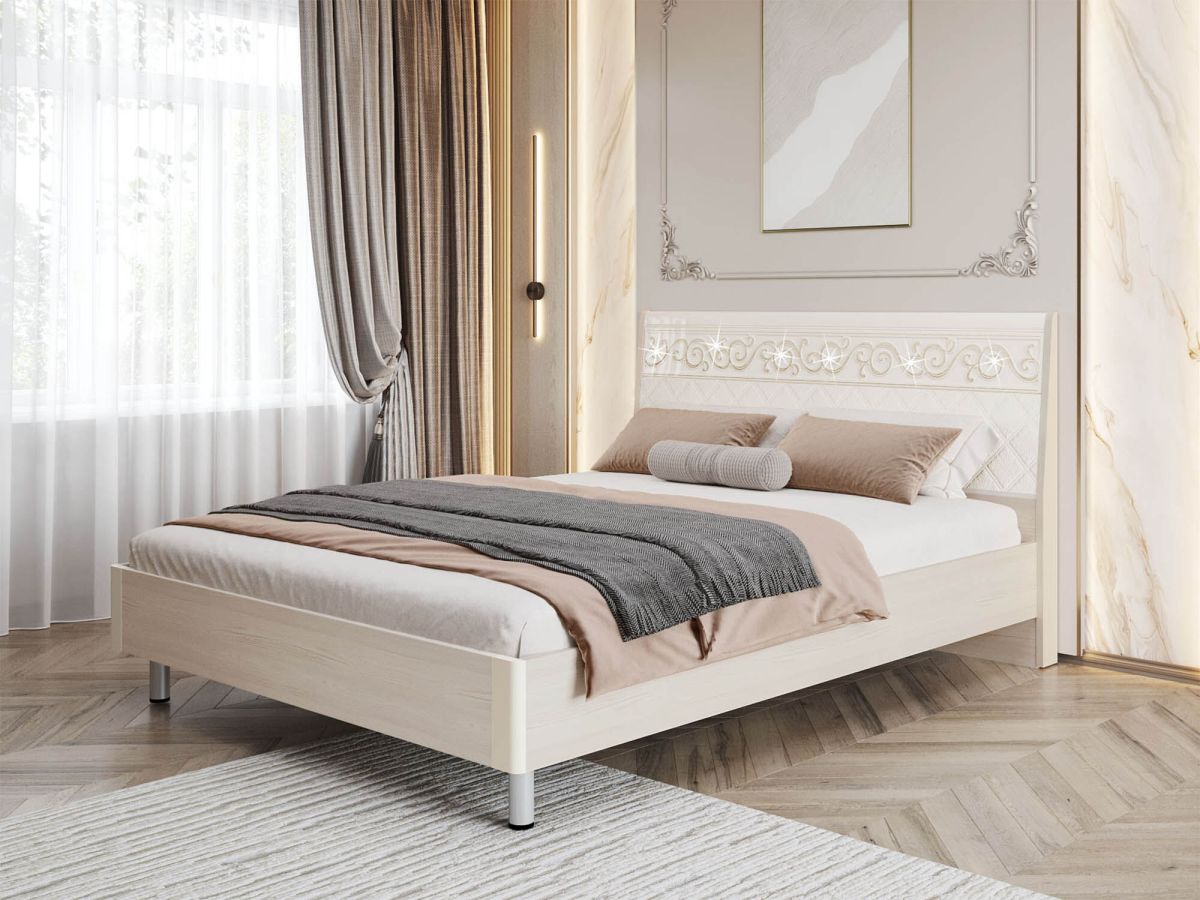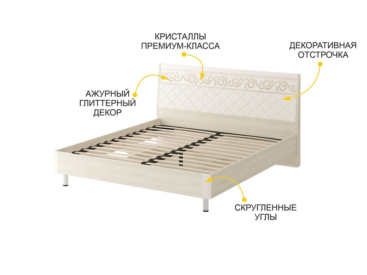 - Спинка кровати декорирована вставкой из экокожи и украшена оригинальной фрезеровкой, глиттерным рисунком и кристаллами премиум-класса.