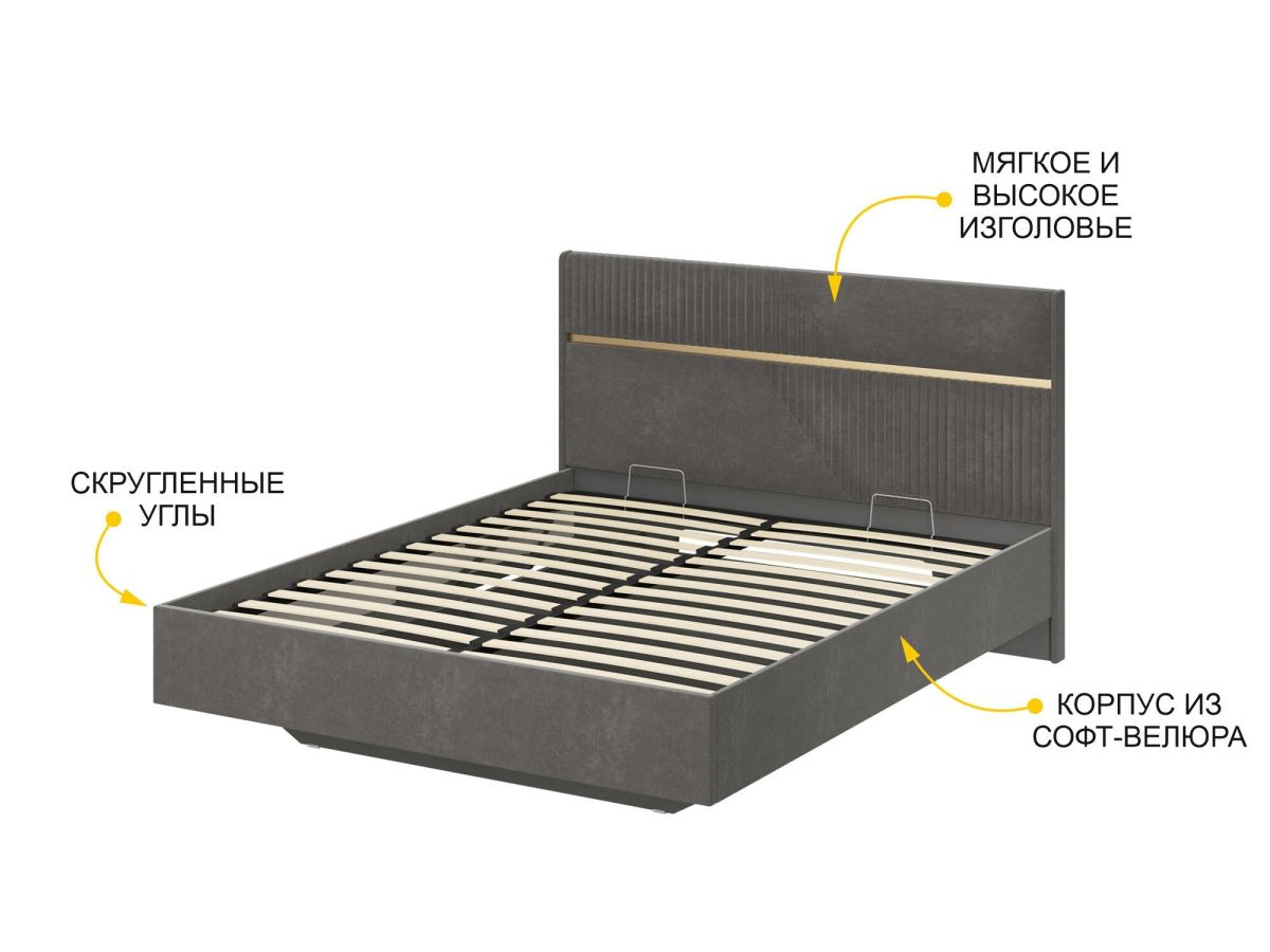 • Актуальный цвет обивки кровати «Десерт серый» прекрасно сочетается с модулями коллекции, а также с предметами интерьера любой другой цветовой гаммы.