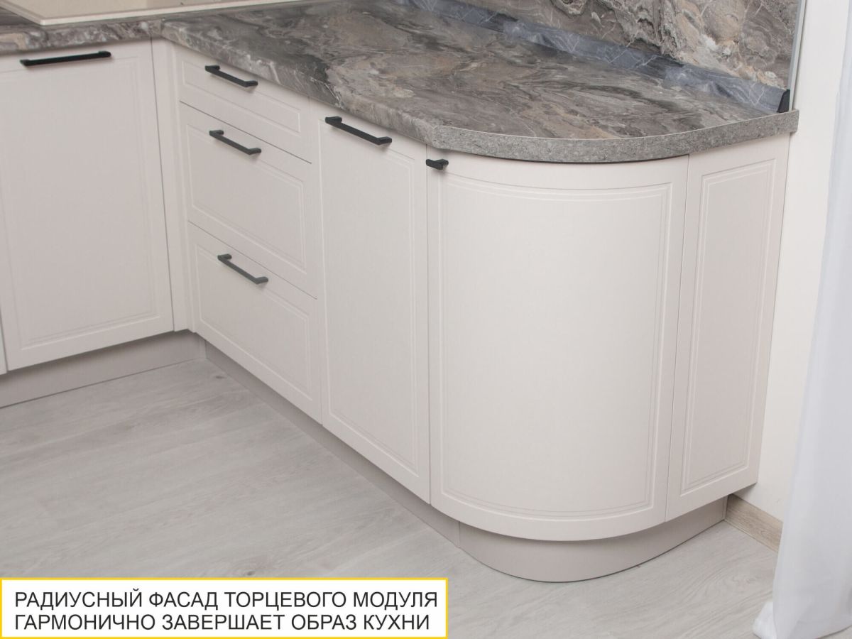 Для корректной комплектации кухни столешницей необходимо использовать радиусный постформинг - ПФР. При расчете длины столешницы рекомендуется свес 10 мм.