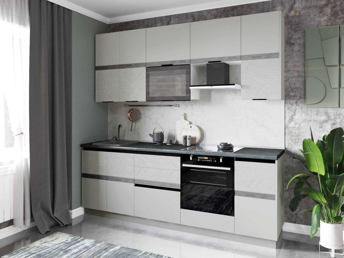 Кухня «Бостон» - воплощение современных тенденций и неповторимого стиля. Отличительная особенность коллекции – сочетание лаконичных форм и высокой функциональности. Актуальный серый цвет является универсальным и легко сочетается с различными цветами и фактурами. Объемное дизайнерское тиснение на фасадах подчеркивает современный стиль кухни. Рельефный рисунок придает оригинальный внешний вид. Контрастные акцентные вставки на фасадах с объемным патинированным рисунком создают сложный образ и придают индивидуальность Вашей кухне.