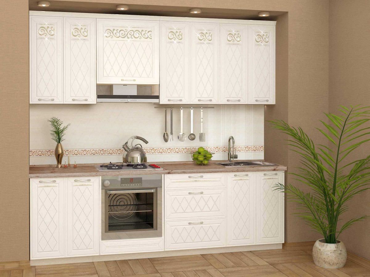 Набор мебели для кухни «Тиффани» – решение для Вашего интерьера в светлых тонах. Фасады украшены ажурной фрезеровкой, глиттерным рисунком и кристаллами премиум-класса. Европейская фурнитура обеспечивает удобную и длительную эксплуатацию. Ножки столов регулируются по высоте для удобной установки модулей и корректировки неровностей пола.