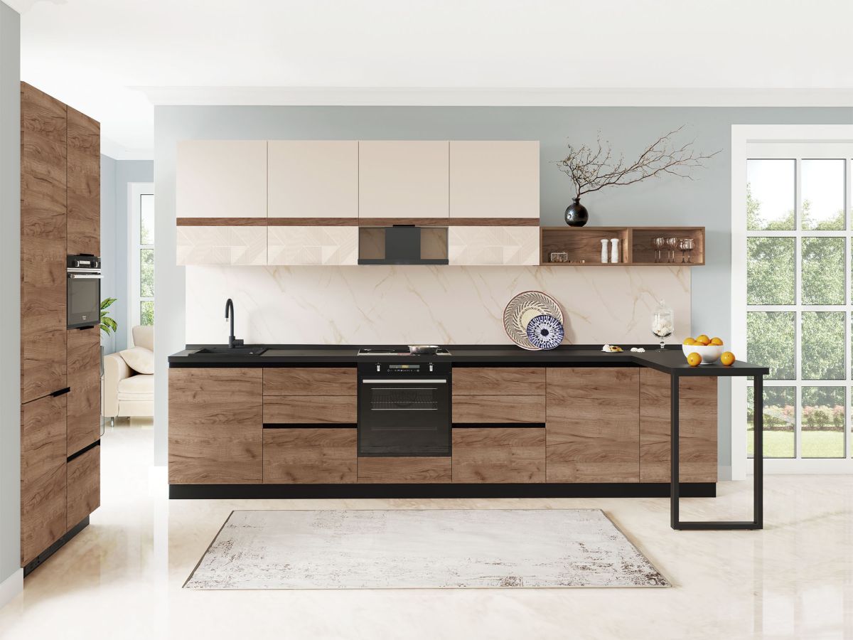 Кухня «Дакота» – воплощение современных тенденций и неповторимого стиля. Сдержанная цветовая гамма в сочетании с древесной текстурой дуба подарят ощущение тепла и уюта Вашему дому, контрастные элементы добавят выразительности и индивидуальности. Легкий 3D-декор с геометричным рисунком на фасадах верхних шкафов подчеркивает современный стиль кухни, а акцентные древесные вставки с патинированным рисунком придают оригинальный внешний вид. Декор, выполненный с технологией патинирования, не стирается и не тускнеет со временем.