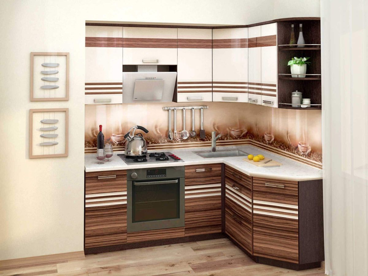 Набор мебели для кухни «Рио» выполнен в гармоничном сочетании цветов «Зебрано глянец» и «Жемчуг глянец». Модули украшены фрезеровкой и стеклянными вставками с рисунком. Оригинальные ручки подчеркивают современный дизайн. Петли с доводчиками обеспечивают плавное и бесшумное закрывание дверок. Регулируемые по высоте ножки позволяют компенсировать возможные неровности пола. Ширина напольных шкафов — 2000x1500 мм. Ширина навесных шкафов с учетом навеса — 2010x1530 мм.