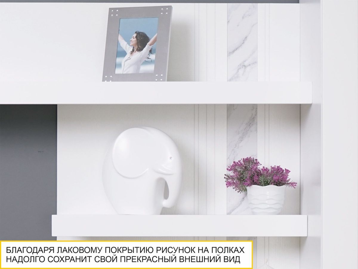 - Полка декорирована стильным мерцающим рисунком под «мрамор», который добавляет оригинальности в интерьер. Благодаря лаковому покрытию декор не стирается со временем.