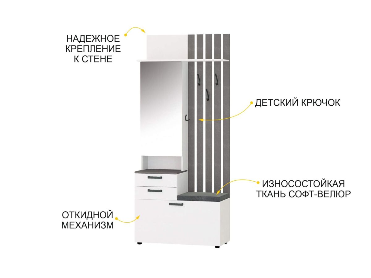 - В нижней части модуля за откидной дверцей находятся полки для обуви, в верхней части — крючки для одежды и полка для головных уборов. Встроенное мягкое сиденье обеспечивает дополнительный комфорт.