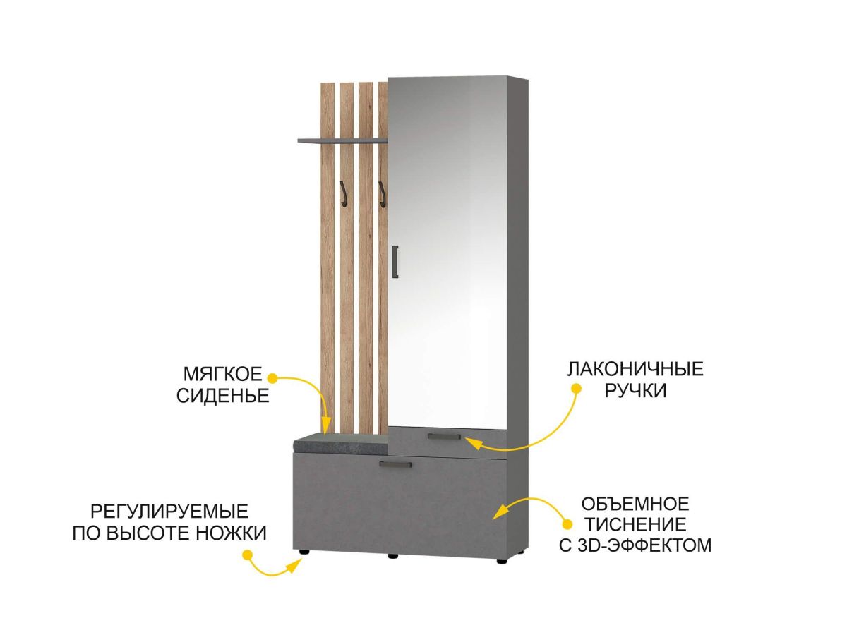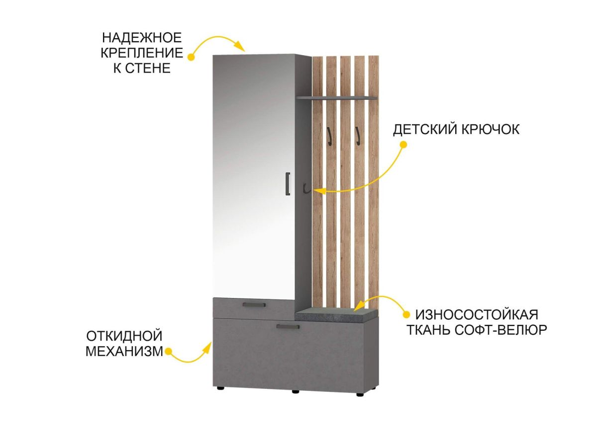 • Мини-прихожая произведена из МДФ и ЛДСП повышенной плотности. Материал устойчив к механическим и термическим воздействиям. ЛДСП выдерживает min 300 циклов на истирание, что почти в 5 раз больше, чем требуется по ГОСТу (min 65).