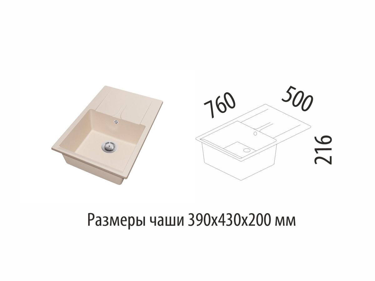 Размеры мойки - 760х500х216 мм, размеры чаши - 390х430х200 мм.