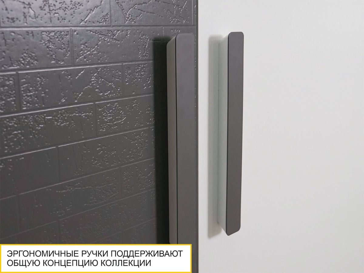 - Фасад в цвете «Графит» декорирован объемным тиснением. Рельефная текстура придает дизайну мебели выразительности, создает глубину и приятные тактильные ощущения.