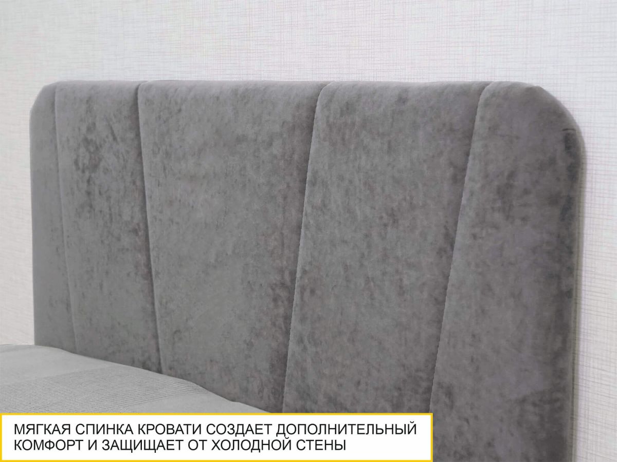 - Мягкая высокая спинка кровати выполнена из прочной износостойкой ткани приятной на ощупь – софт-велюр. Материал не требует специального ухода и легко чистится.