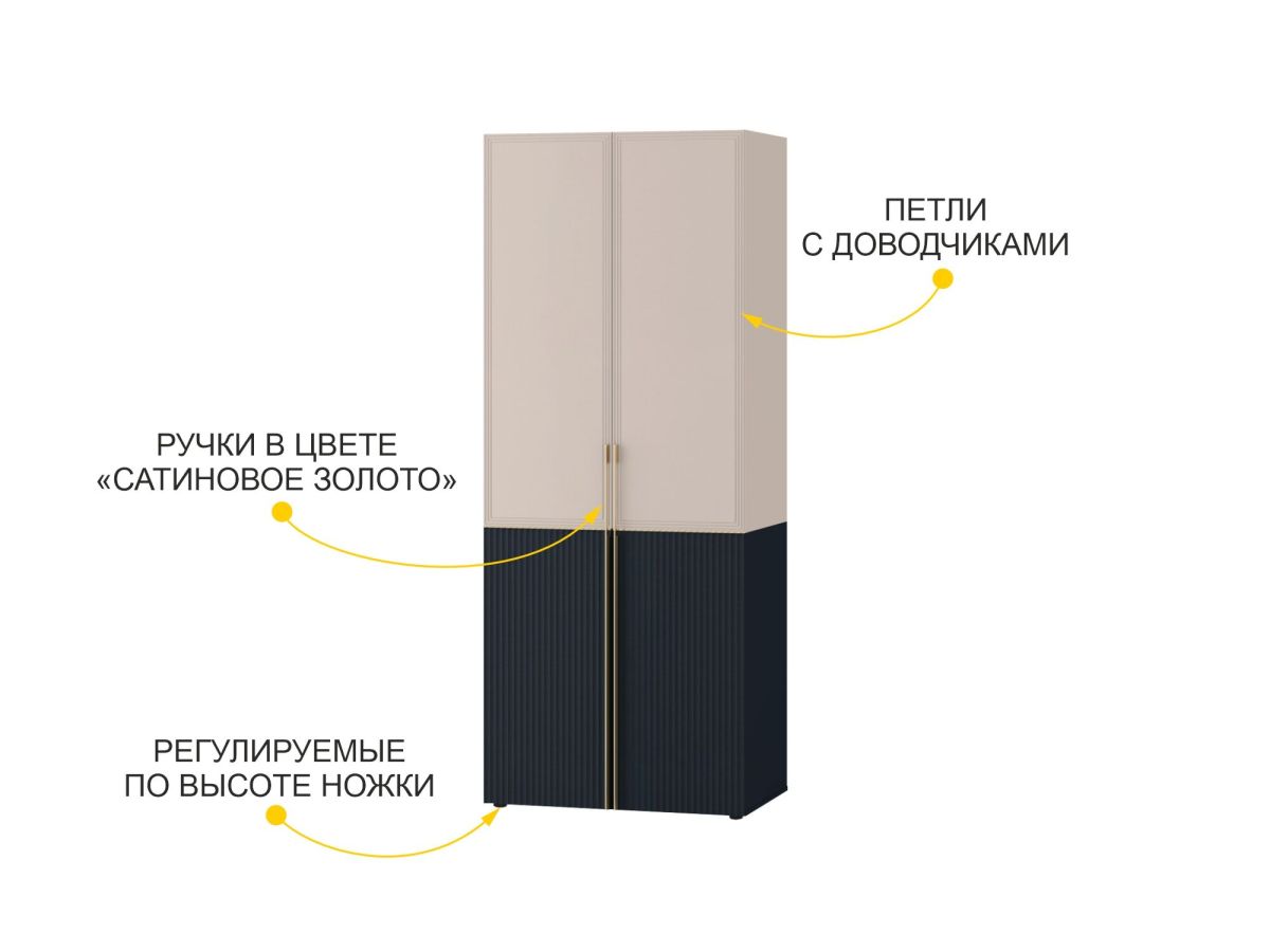 - Акцентные длинные ручки «в пол» подчеркивают вертикальные линии фасадов и придают изделию особый шик и роскошь.