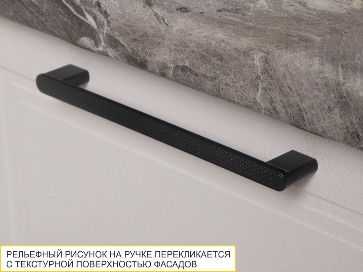 - Металлическая ручка черного цвета дополняет гармоничный образ кухни. Рельефный рисунок перекликается с текстурной поверхностью фасадов, создавая тактильное и визуальное единство.