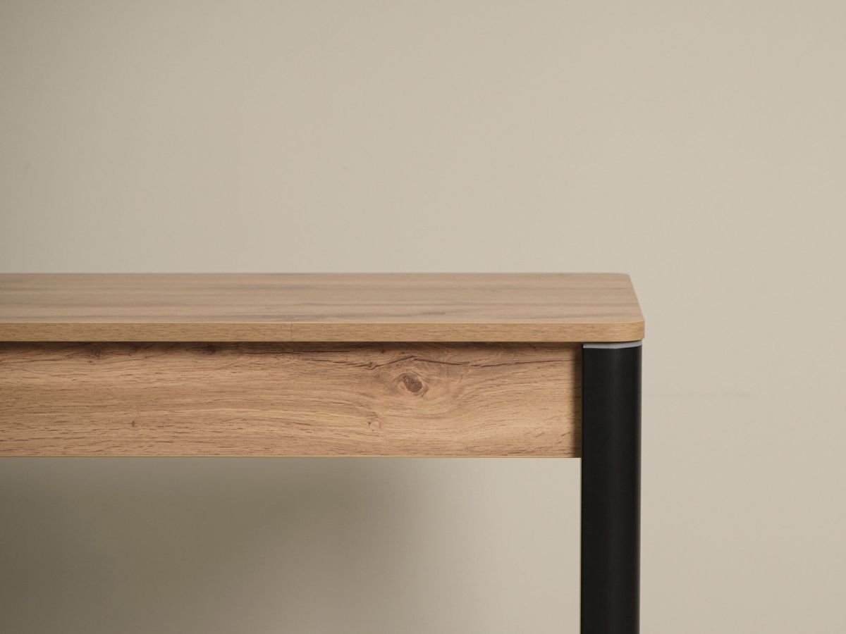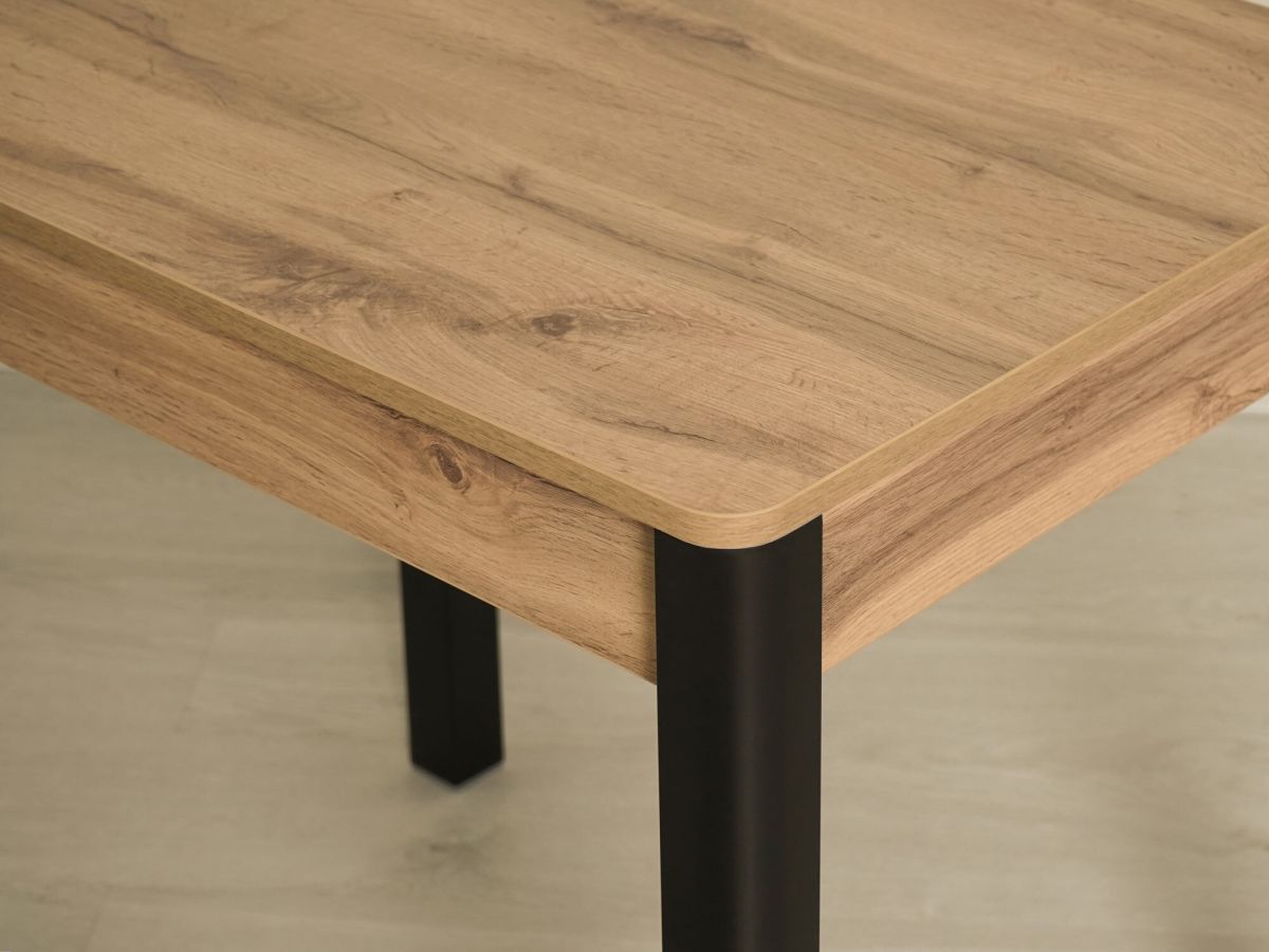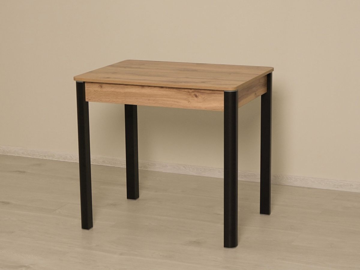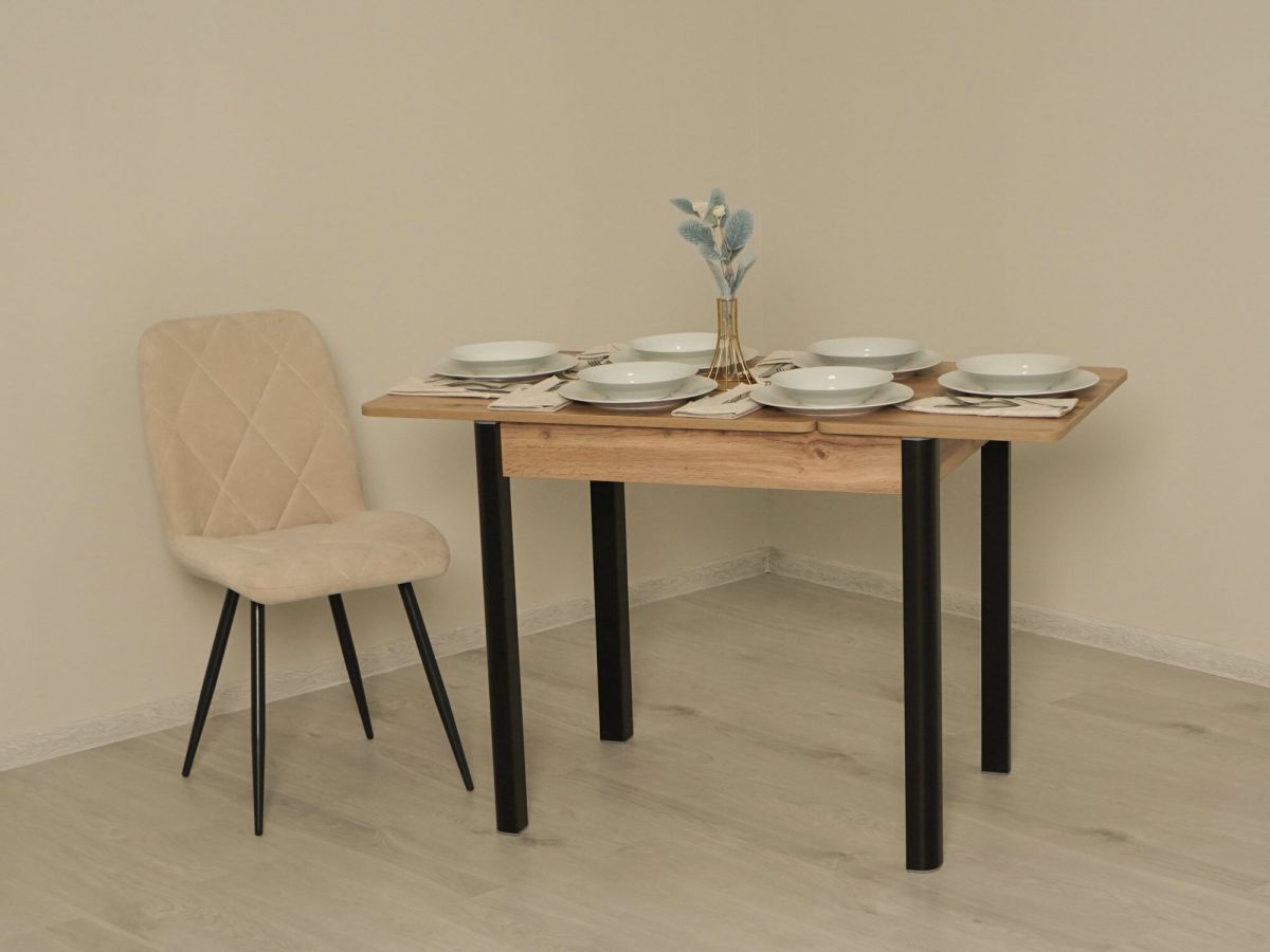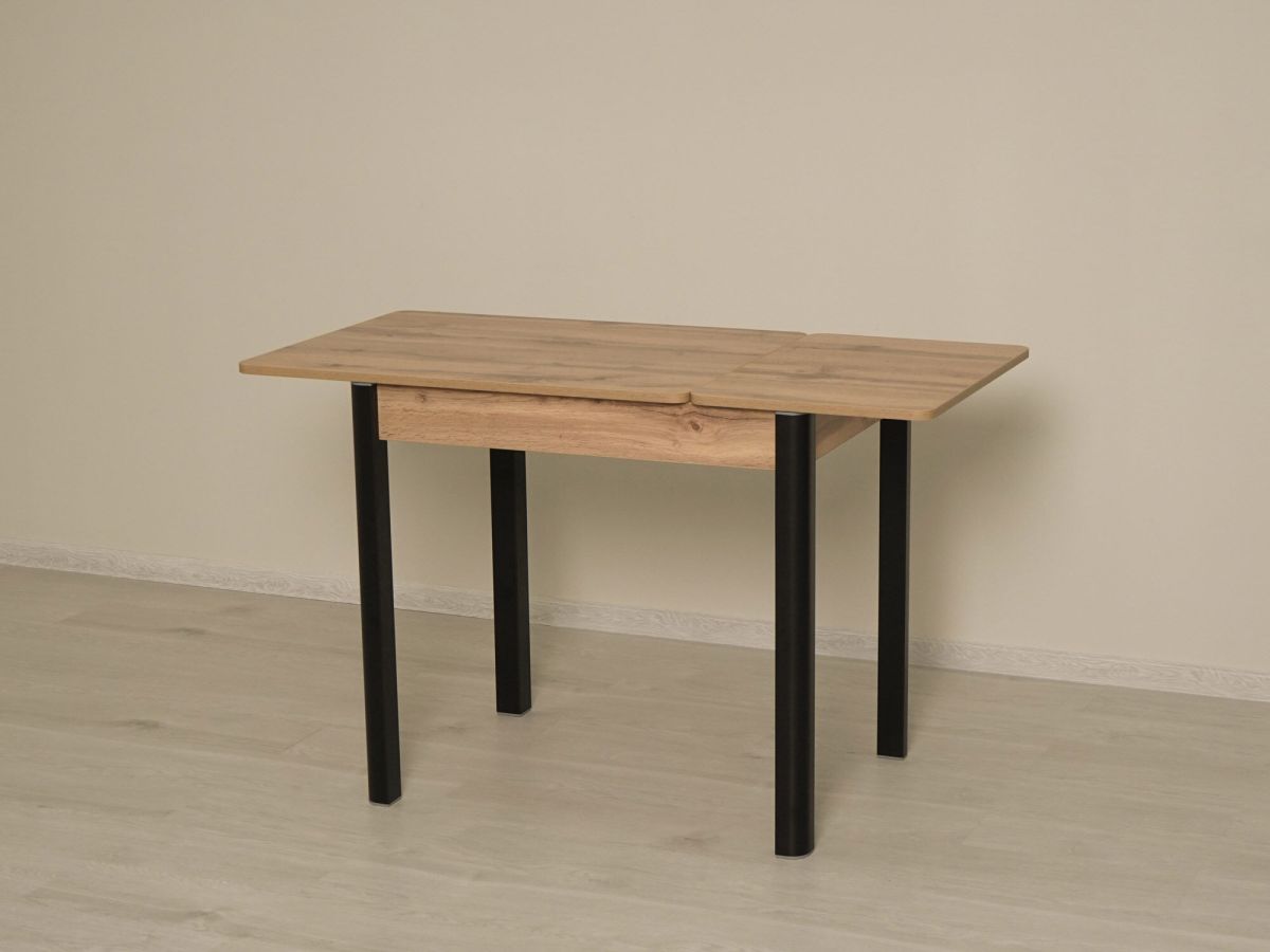 Теплый оттенок натурального дерева создает уютную атмосферу, а контрастные металлические опоры черного цвета подчеркивают современный дизайн изделия. В сложенном виде размер стола – 82х60 см, в разложенном – 122х60 см; высота стола 75 см.