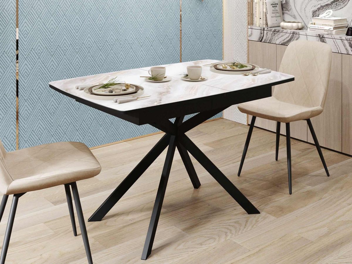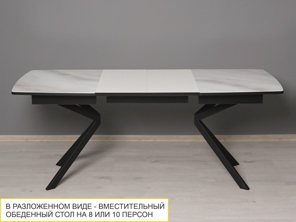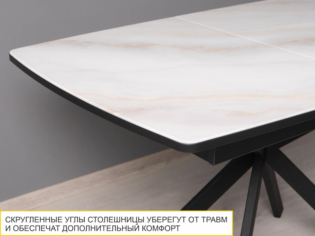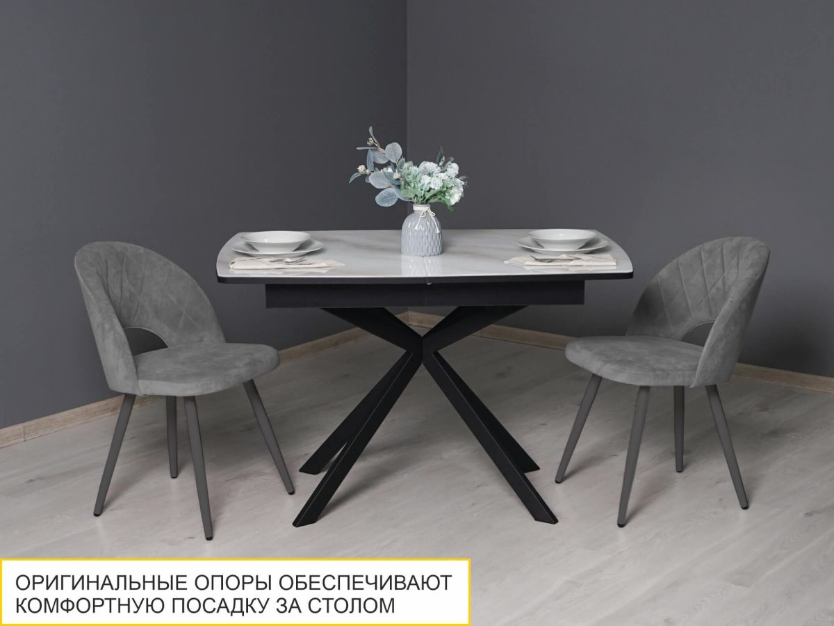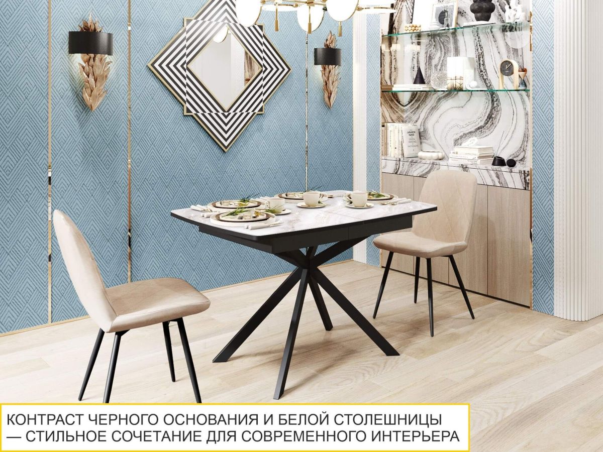 - Матовые металлические опоры в контрастном черном цвете придают модели современный характер и визуальную динамику, делая стол стильным акцентом в интерьере.