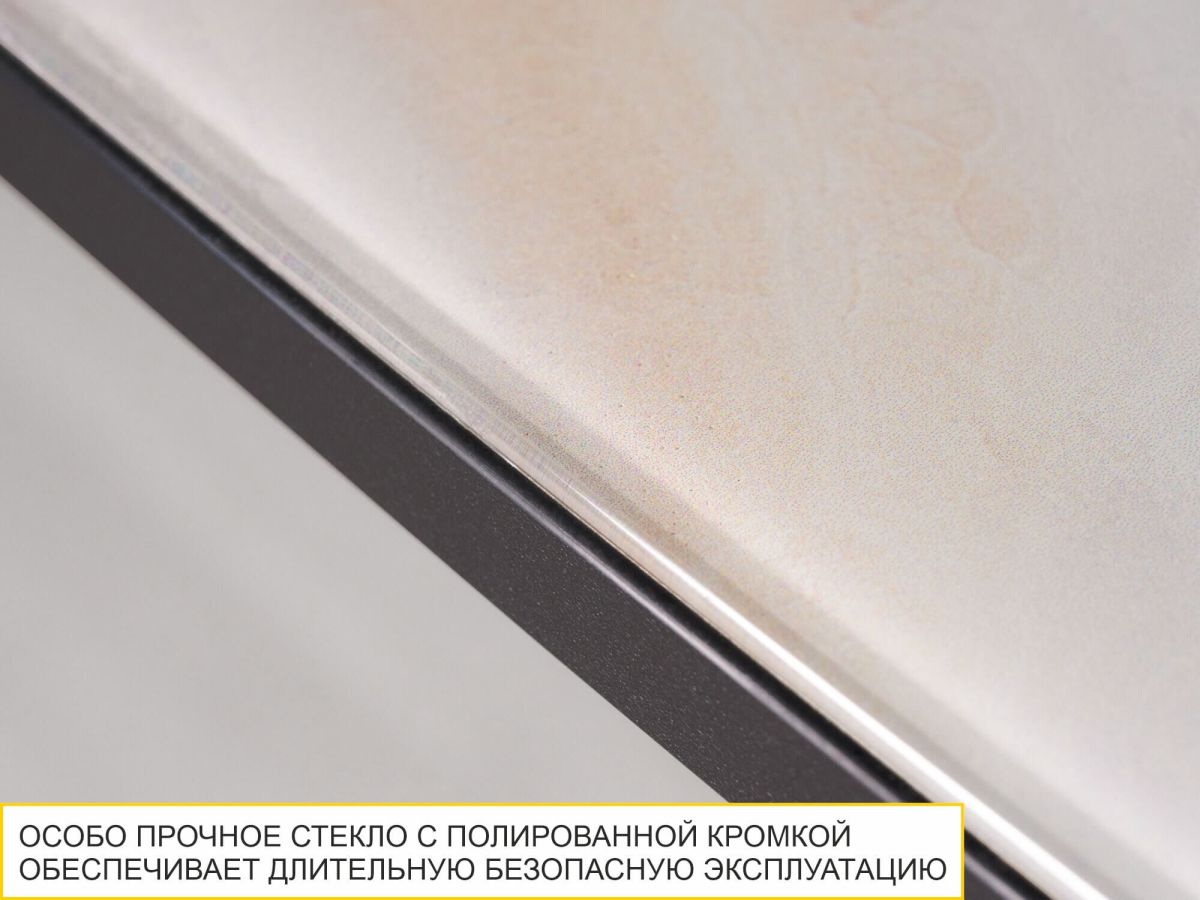 - Особо прочное стекло с полированной кромкой обеспечивает длительную безопасную эксплуатацию. Для предотвращения повреждения стеклянной столешницы горячую посуду следует ставить только на специальную подставку.