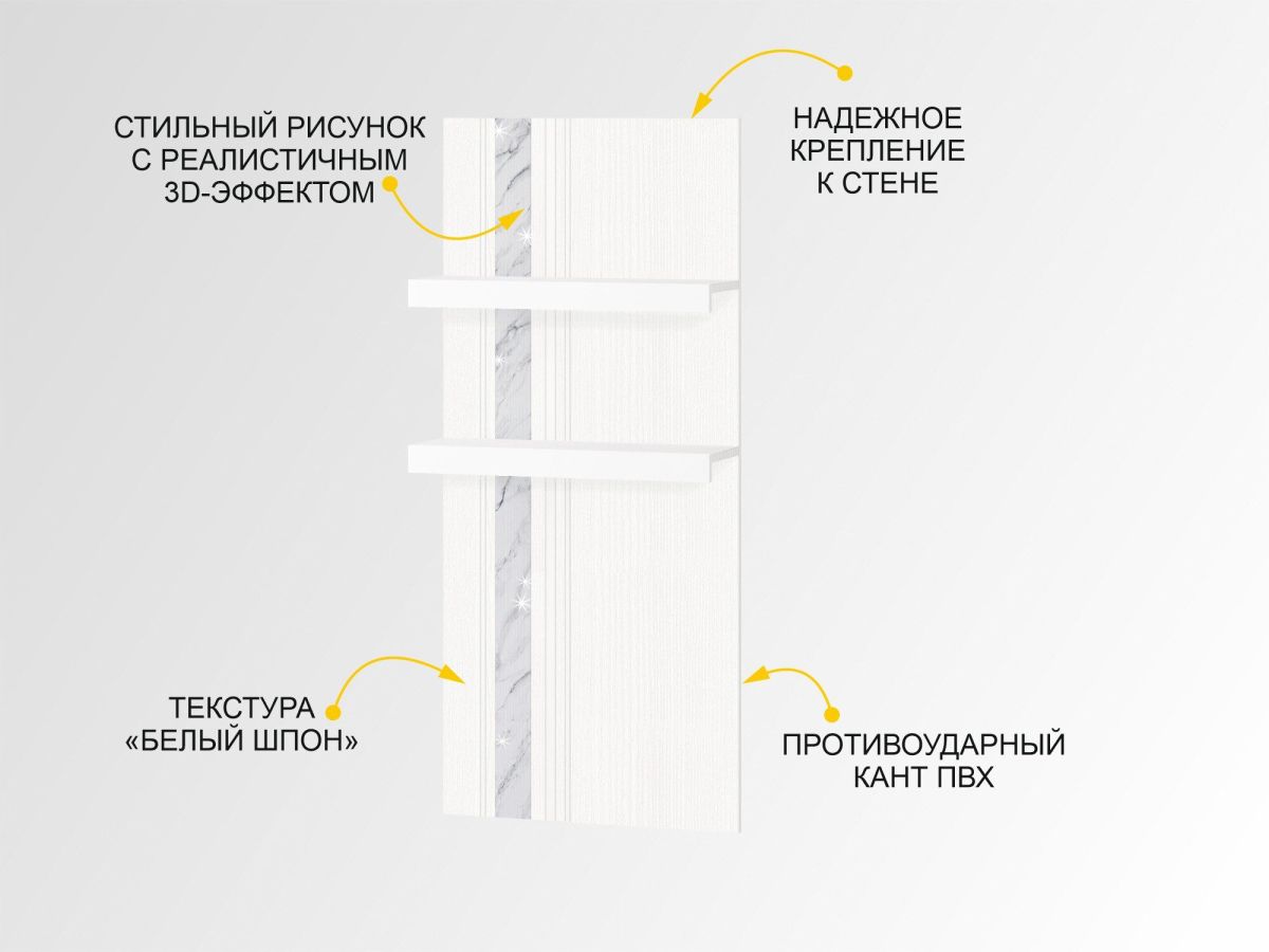 - Панель с полками декорирована стильным мерцающим рисунком под «мрамор», который привлекает внимание и подчеркивает уникальность изделия. Благодаря лаковому покрытию декор не стирается со временем.