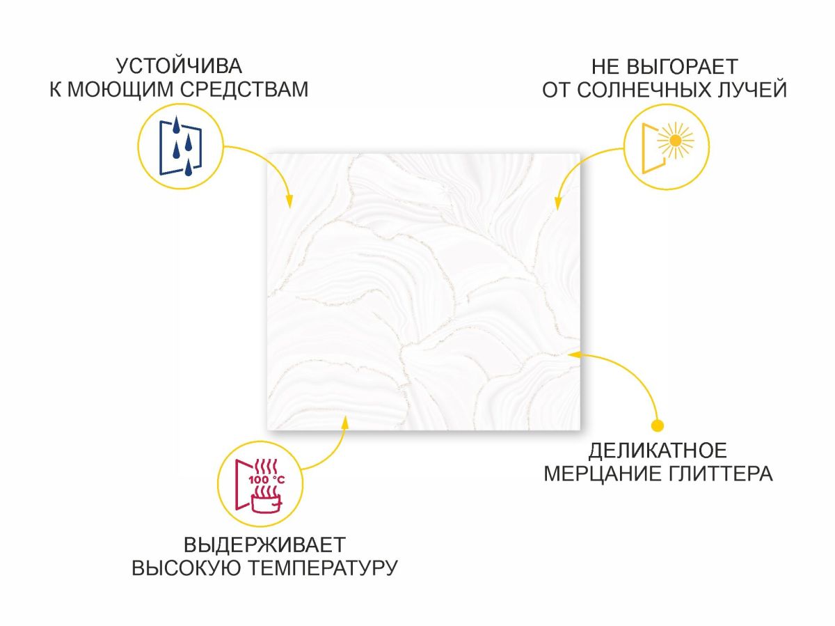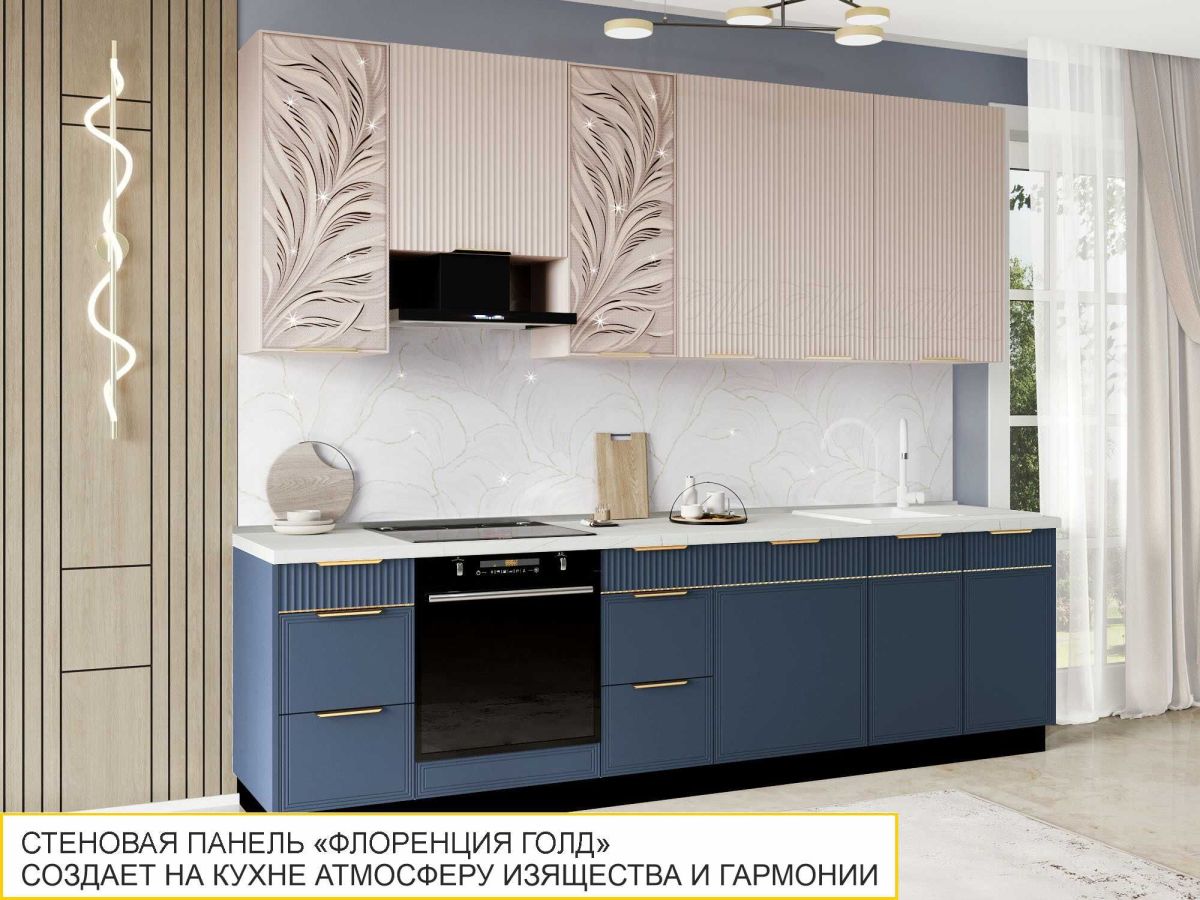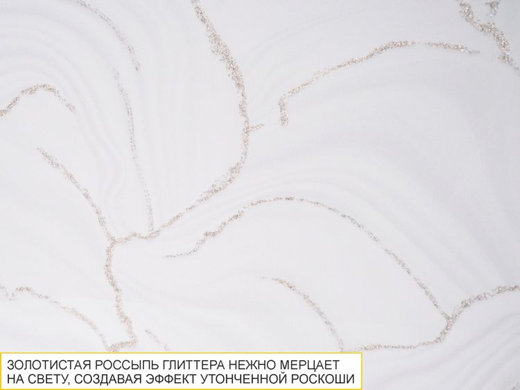 Дизайн стеновой панели для кухни «Флоренция ГОЛД» воплощает собой элегантность и изысканную красоту. Панель украшена мягкими плавными линиями в светлых тонах, которые напоминают узоры натурального мрамора. Особое внимание привлекают тонкие золотистые прожилки с россыпью глиттера, которые изящно переплетаются с основным узором, добавляя панели роскошный и благородный акцент. Эти золотистые детали нежно мерцают на свету, создавая эффект утонченной роскоши, который подчеркивает общий стиль интерьера. «Флоренция ГОЛД» — это идеальный выбор для тех, кто стремится создать на кухне атмосферу изящества и гармонии. Глянцевая поверхность стеновой панели придаёт интерьеру свежий и современный вид, отражая свет и визуально расширяя пространство.