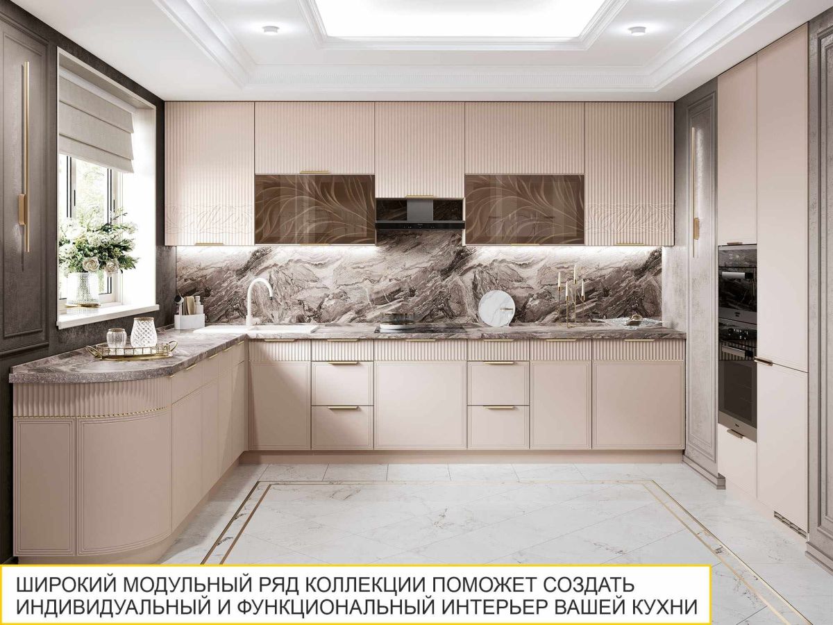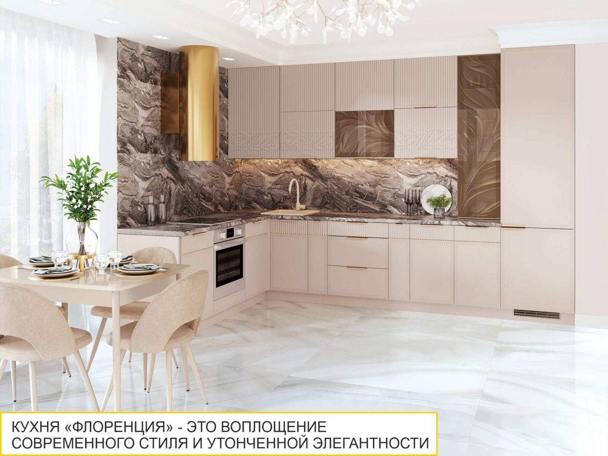 Кухня «Флоренция» - это образец изящности и современной роскоши. Она идеально подходит для тех, кто ценит не только функциональность, но и особую изысканность и шик. Безупречный образ, основанный на уникальном дизайне, инновационных технологиях и исключительном мастерстве исполнения, делает кухню «Флоренция» магнитом для притяжения внимания. Гармонично подобранные цвета создают ощущение уюта и спокойствия, а акцентные ручки и оригинальная металлическая пластина в цвете «сатиновое золото» придают мебели роскошный вид. Модная фрезеровка «рейки» на фасадах в сочетании с текстурной поверхностью и тройной рамкой создают неповторимый дизайн коллекции.
