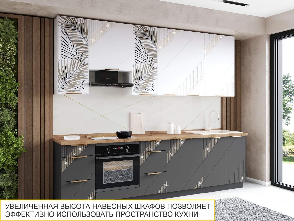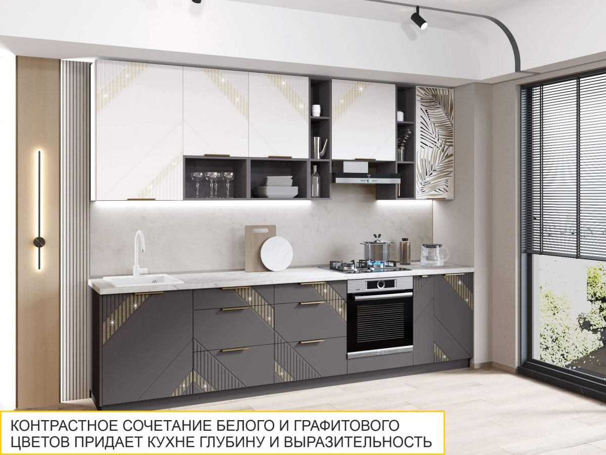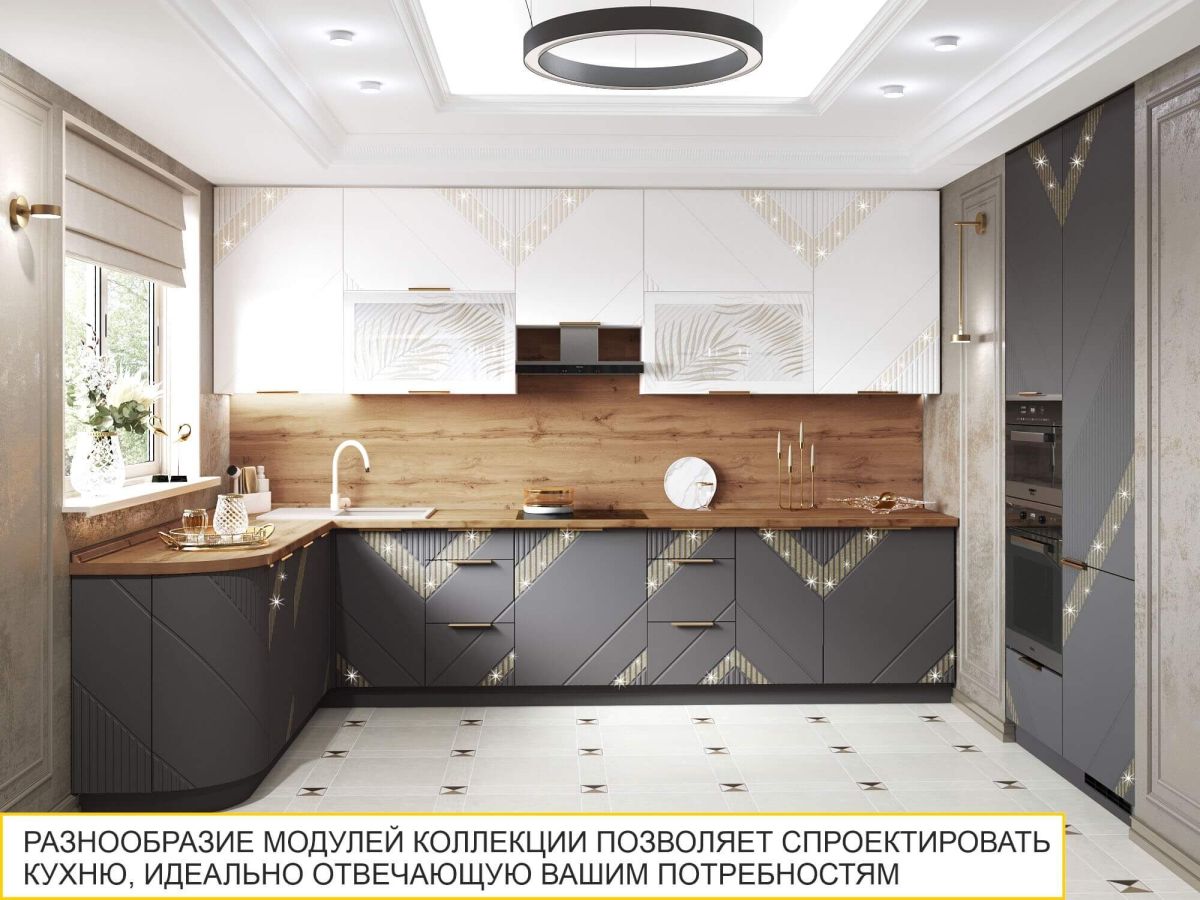 Коллекция «Монако» - это образец элегантного стиля и утонченного вкуса. Эффектная фрезеровка с объемным 3D-рисунком и россыпью глиттера подчеркивает эксклюзивный и уникальный вид изделия. Фасады выполнены в насыщенном цвете «Графит», который добавляет кухне глубины и контраста, подчеркивая элегантность дизайна. Благодаря сочетанию строгих линий и текстур кухня выглядит стильно, дорого и современно.