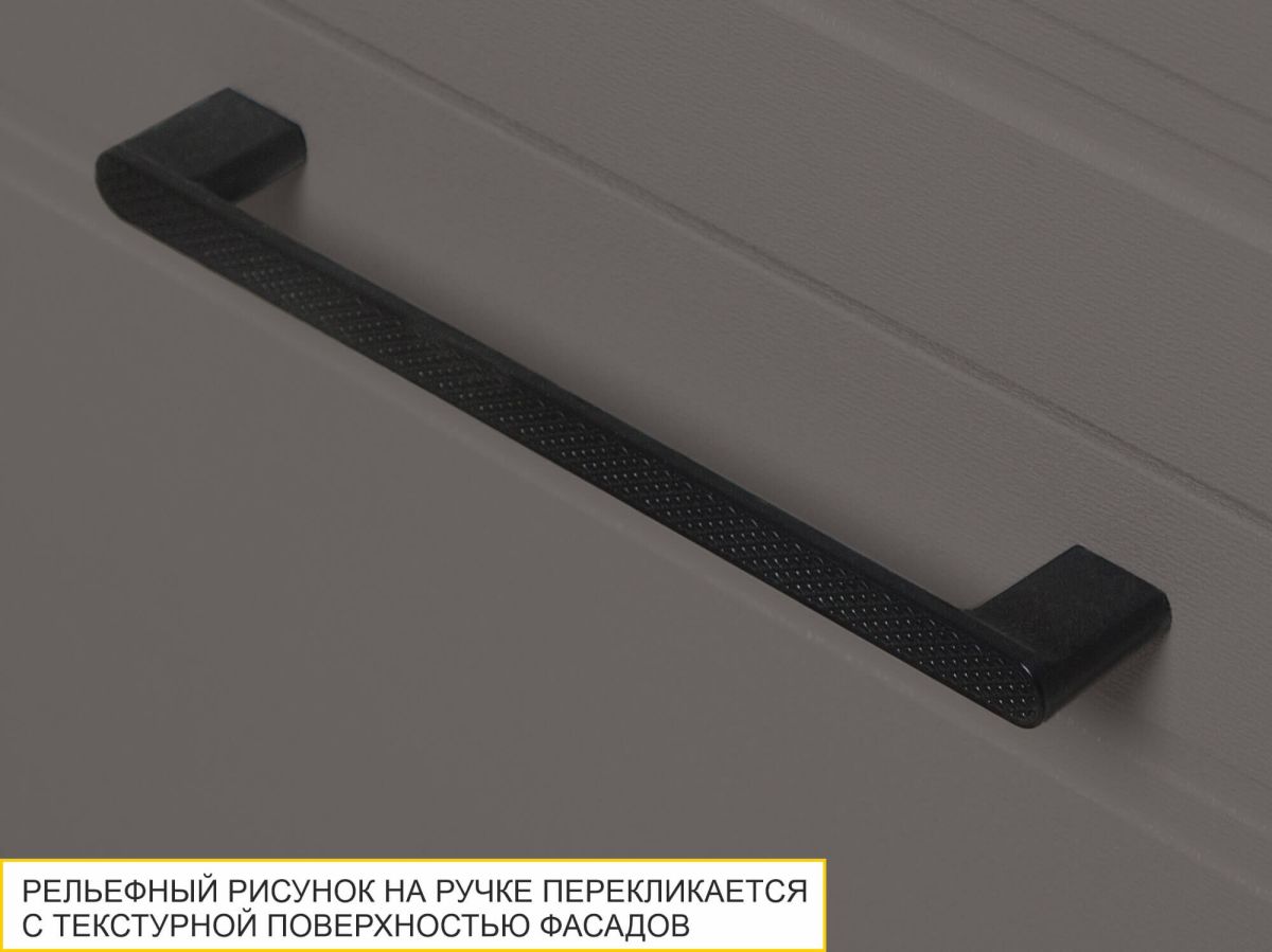 - Металлические ручки черного цвета дополняют гармоничный образ кухни. Рельефный рисунок перекликается с текстурной поверхностью фасадов, создавая тактильное и визуальное единство.