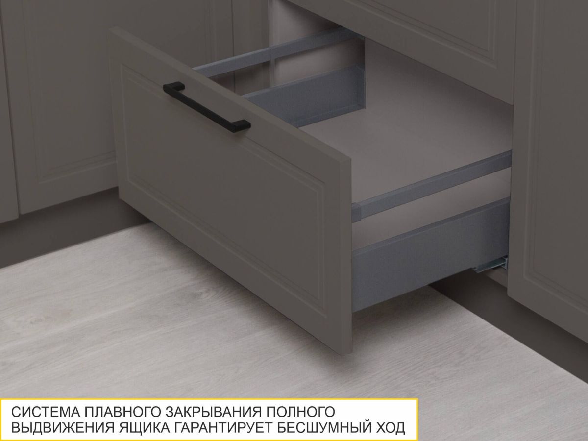 - В нижней части пенала предусмотрен выдвижной ящик, оснащенный системой плавного закрывания полного выдвижения, которая обеспечивает плавный бесшумный ход и длительный срок эксплуатации изделия.