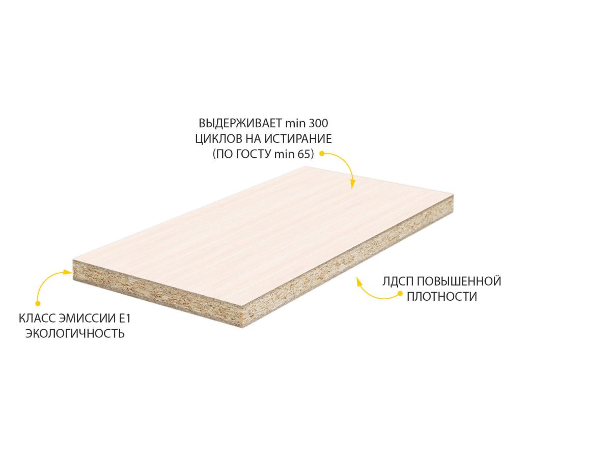 - ЛДСП выдерживает min 300 циклов на истирание, что почти в 5 раз больше, чем требуется по ГОСТу (min 65).