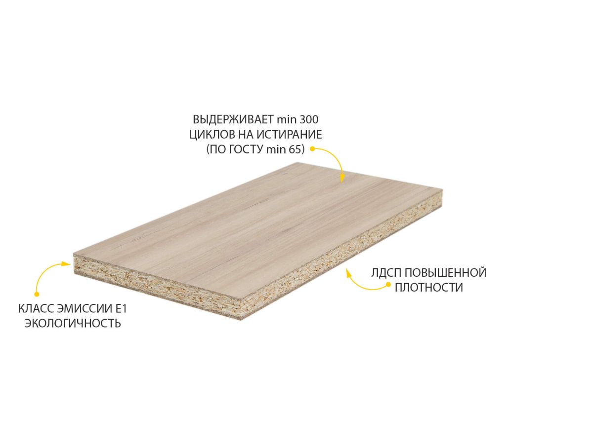 - ЛДСП выдерживает min 300 циклов на истирание, что почти в 5 раз больше, чем требуется по ГОСТу (min 65).