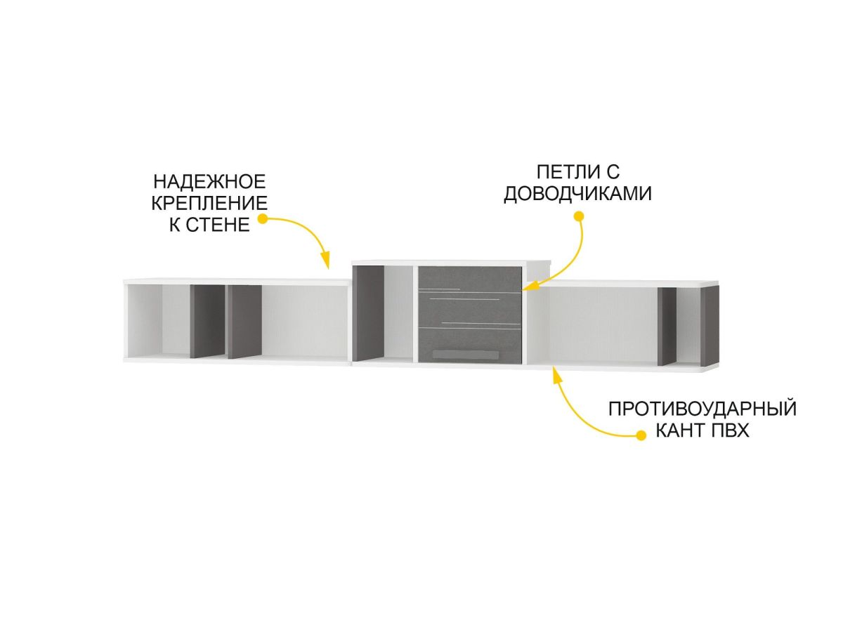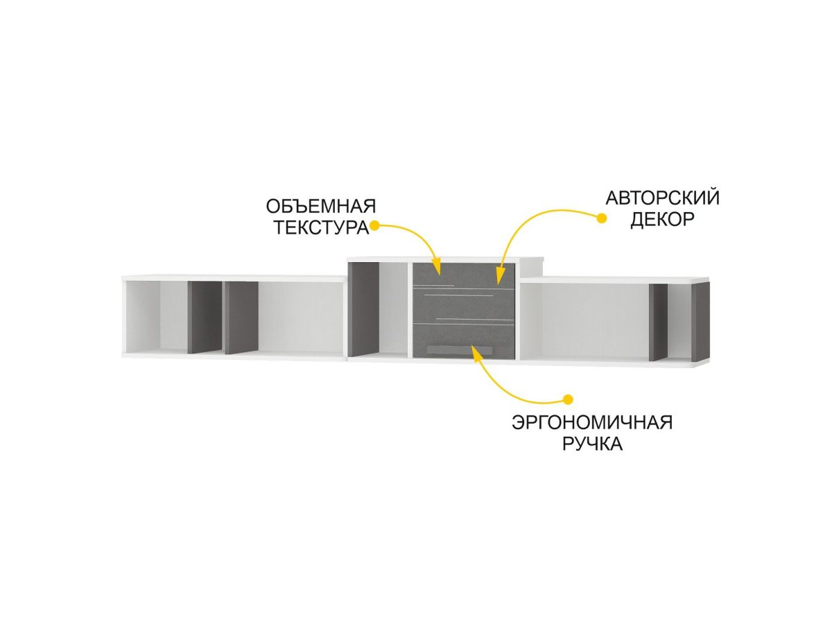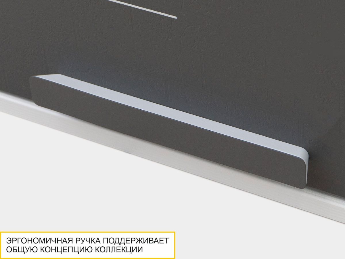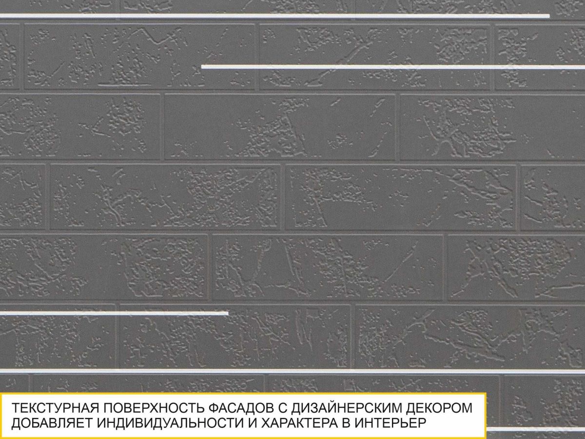 - Фасад в цвете «Графит» декорирован объемным тиснением. Рельефная текстура придает дизайну мебели выразительности, создает глубину и приятные тактильные ощущения.