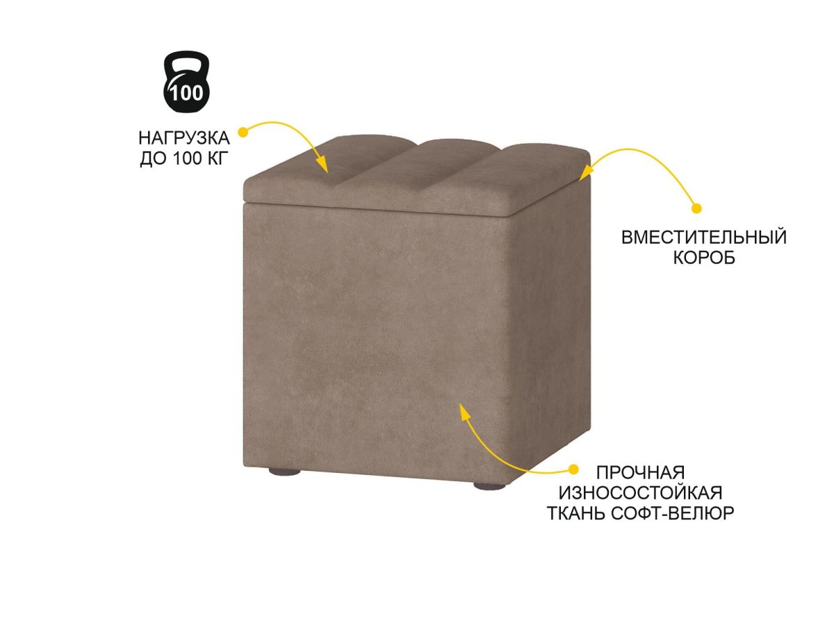 - Сиденье и боковины пуфика обтянуты прочным и приятным на ощупь софт-велюром. Материал не требует специального ухода и легко чистится.