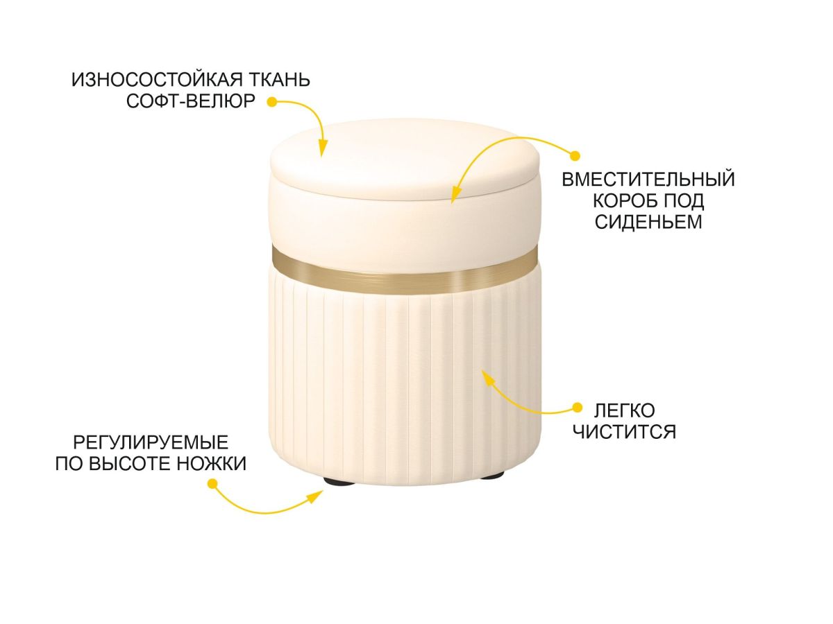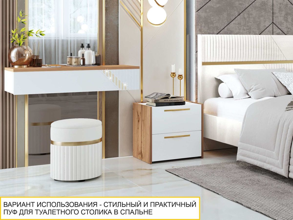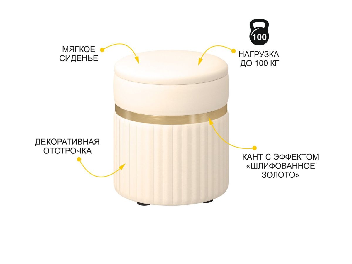 - Стильная отстрочка пуфа идеально дополняет рисунок фрезеровки на фасадах. В сочетании с декоративным металлизированным кантом с эффектом шлифованного золота она придает изделию изысканный внешний вид.
