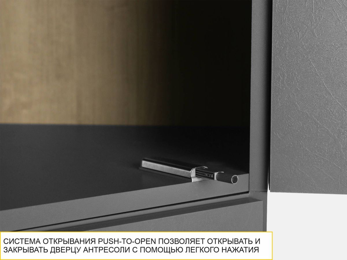 - Система открывания Push-to-Open позволяет открывать и закрывать дверцу антресоли с помощью легкого нажатия без использования мебельных ручек.