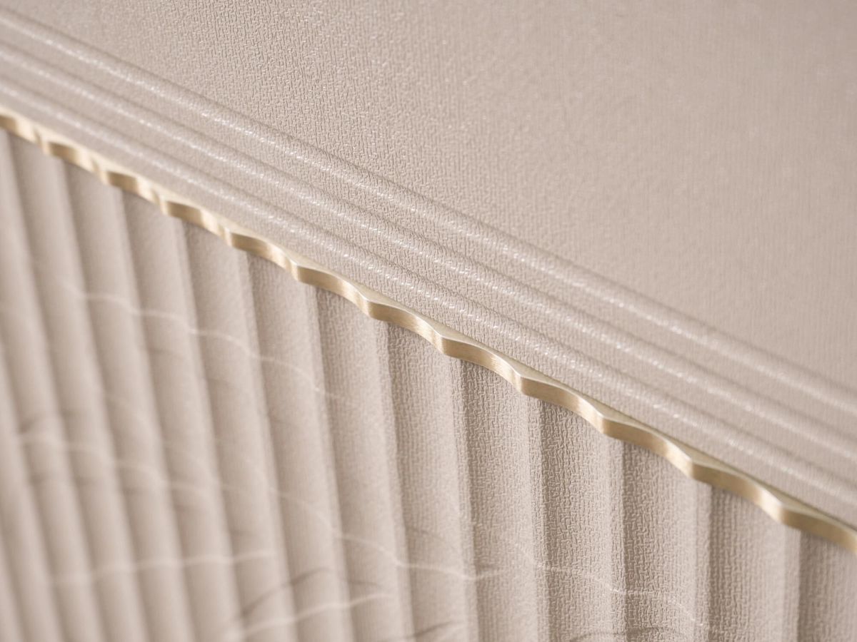 • Металлическая пластина на фасаде толщиной 5 мм проходит обработку по собственной технологии покрытия, которая придает ей изысканный оттенок «сатинового золота». Она гармонично сочетается с цветом фурнитуры и повторяет геометрию вертикальных реек.