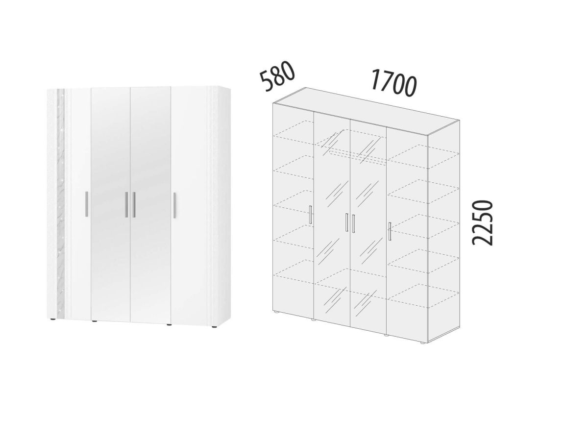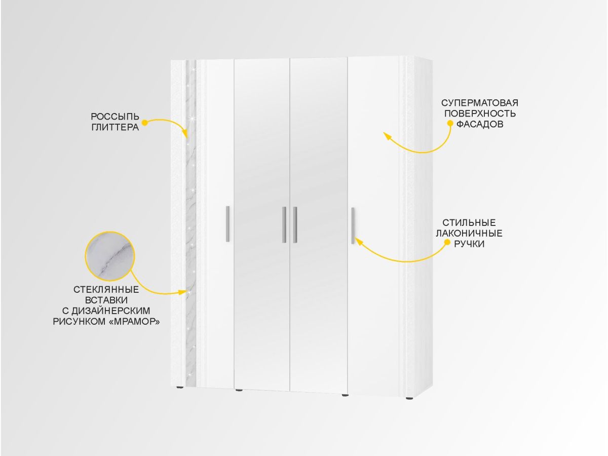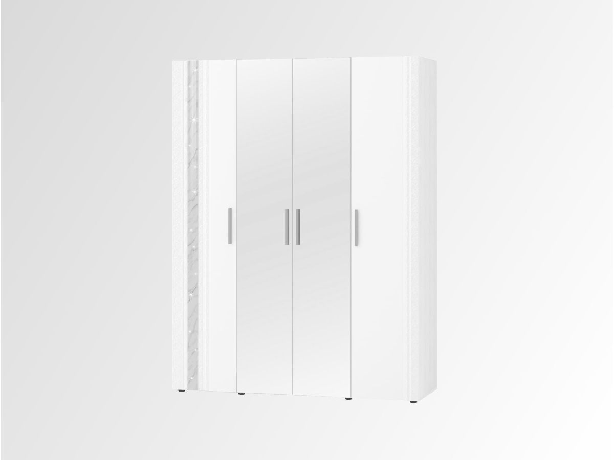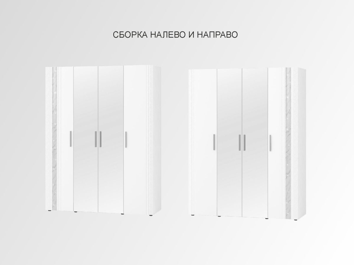 Шкаф четырехдверный с зеркалом «Николь 901.14» является частью модульной программы «Николь». Сочетание белоснежных матовых фасадов с нежно-серым мерцающим декором «мрамор» - визитная карточка этой коллекции. Конструктив и дизайн модели продуман до мелочей.