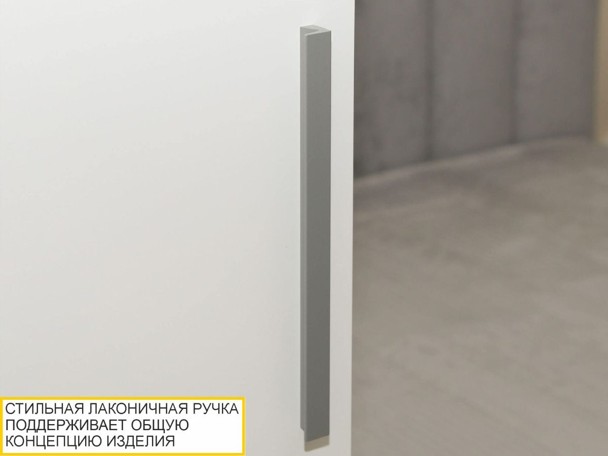 • Дверцы шкафа декорированы лаконичной фрезеровкой с объемным 3D-рисунком и стеклянной вставкой из прочного осветленного стекла Crystal с рисунком «мрамор».