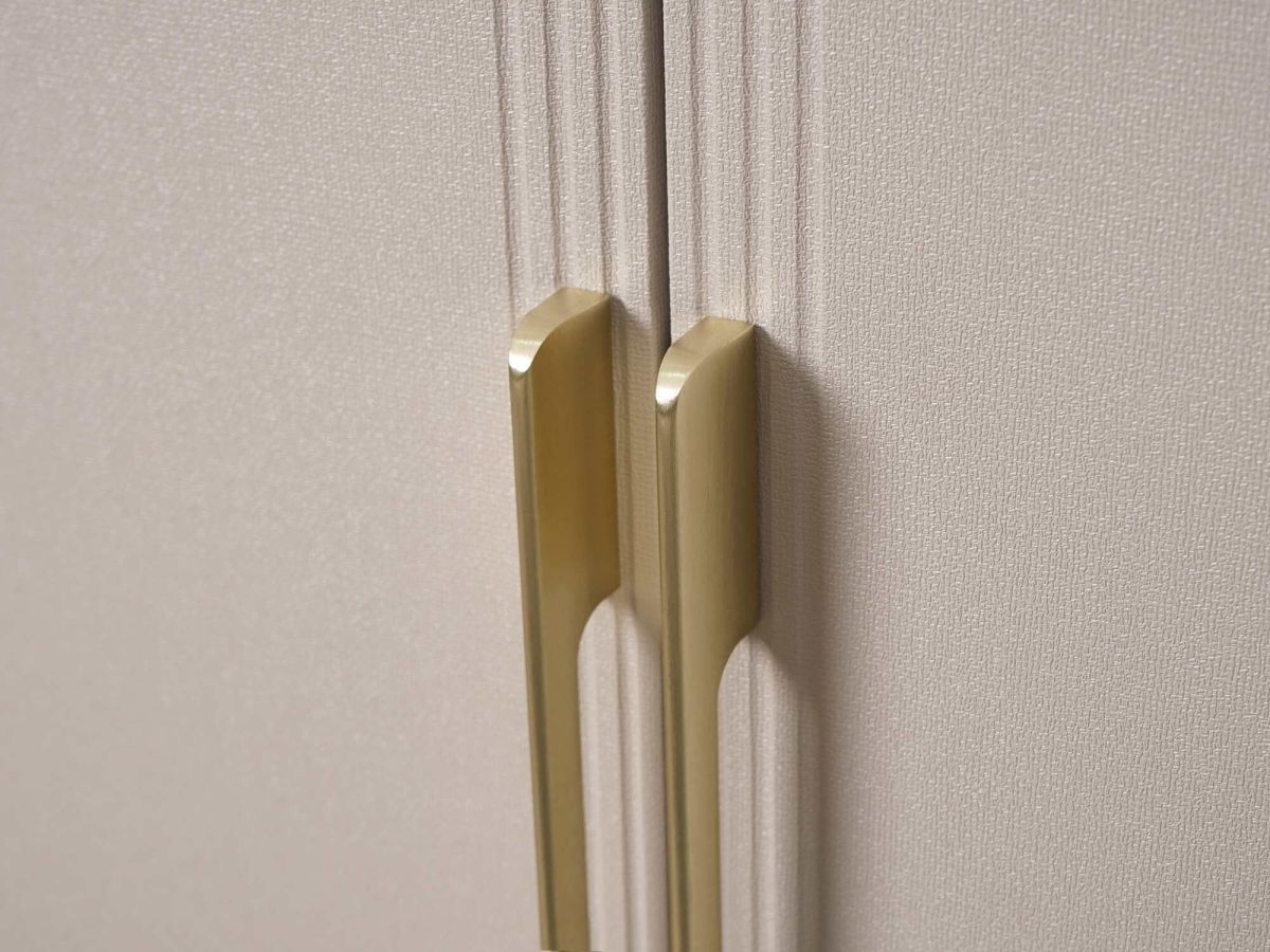 - Металлическая пластина на фасаде толщиной 5 мм проходит обработку по собственной технологии покрытия, которая придает ей изысканный оттенок «сатинового золота». Она гармонично сочетается с цветом фурнитуры и повторяет геометрию вертикальных реек.