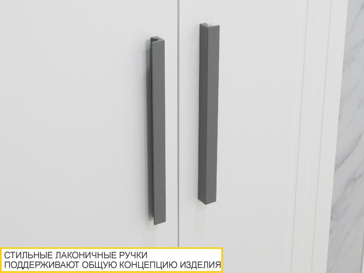 - Дверцы шкафа декорированы лаконичной фрезеровкой с объемным 3D-рисунком и стеклянной вставкой из прочного осветленного стекла Crystal с рисунком «мрамор».