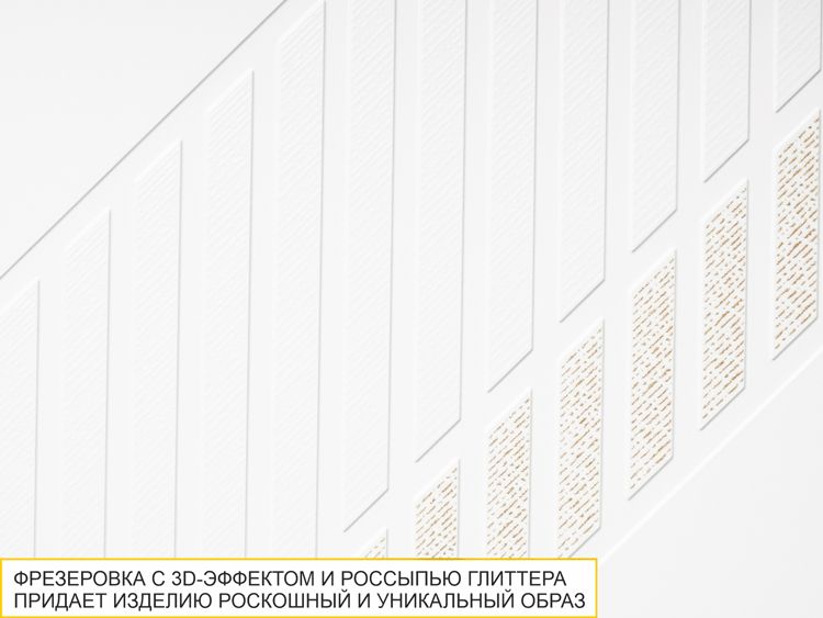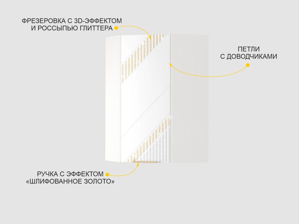 Коллекция «Монако» - это образец элегантного стиля и утонченного вкуса. Эффектная фрезеровка с объемным 3D-рисунком и россыпью глиттера подчеркивает эксклюзивный и уникальный вид изделия. Цвет верхних фасадов «Альпийский белый» визуально увеличивает пространство, делая его более светлым и воздушным. Он идеально сочетается с тёмными фасадами нижних шкафов, создавая эффектный контраст.
